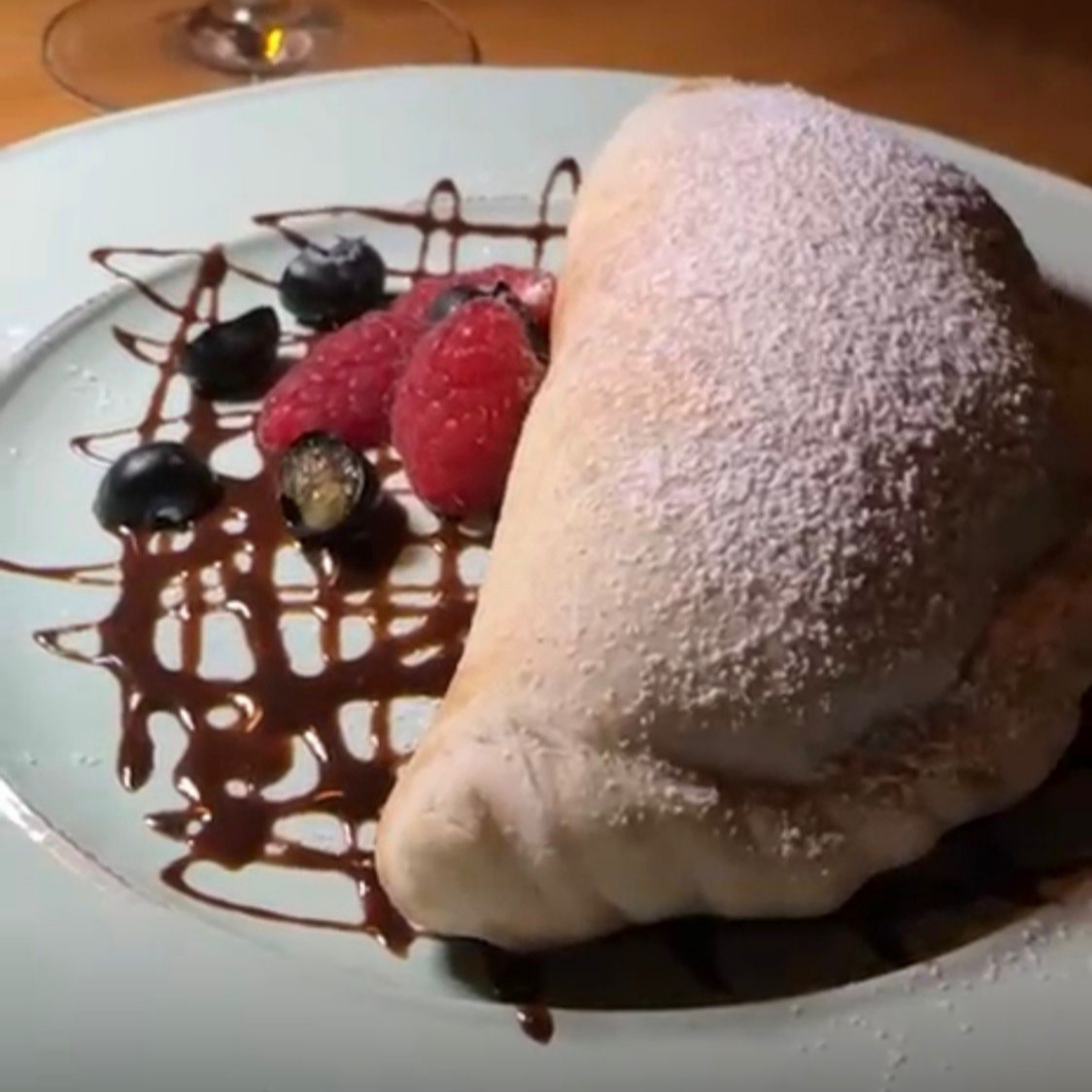Masa de pizza rellena de Nutella con frutos rojos, horneada a la leña.