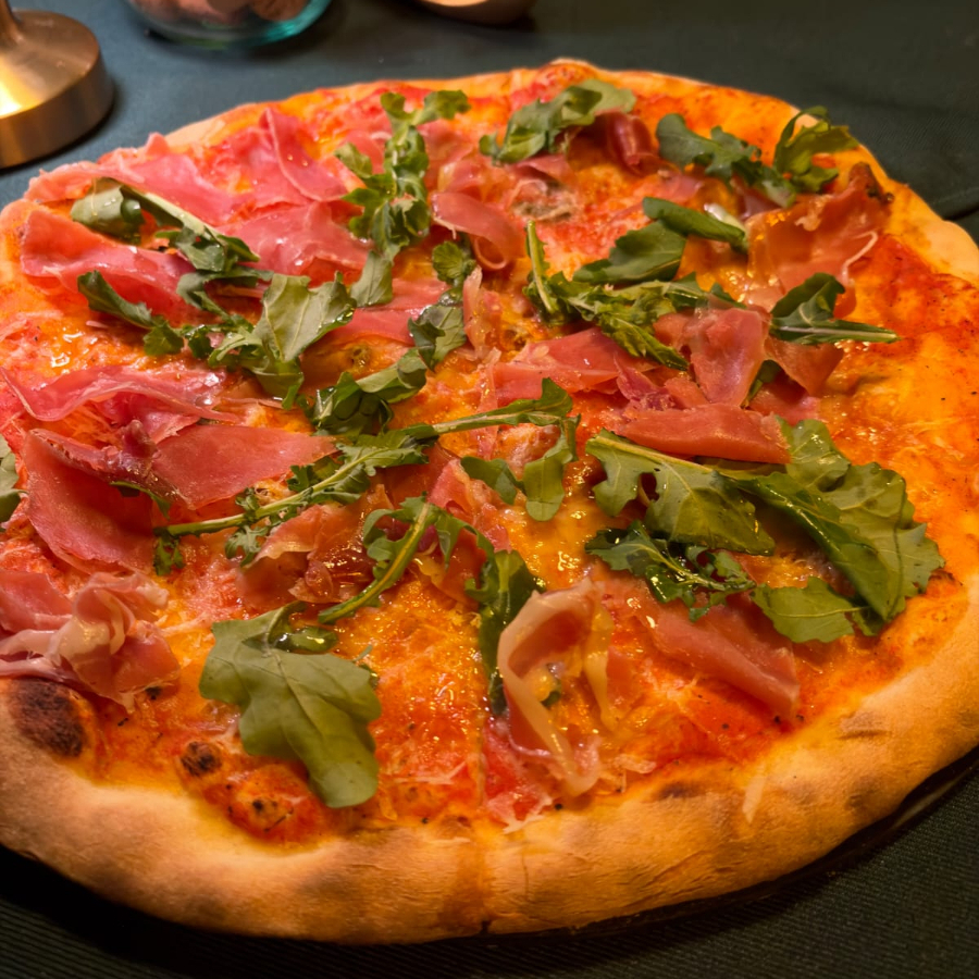 Pizza de 30 cm con base de jitomate, mozzarella, jamón serrano, arúgula y parmesano.