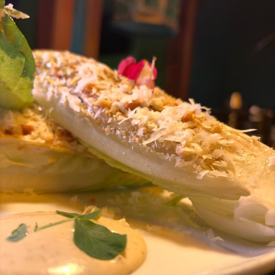 Corazones de lechuga a la plancha con aderezo César de la casa, crutones y queso parmesano.