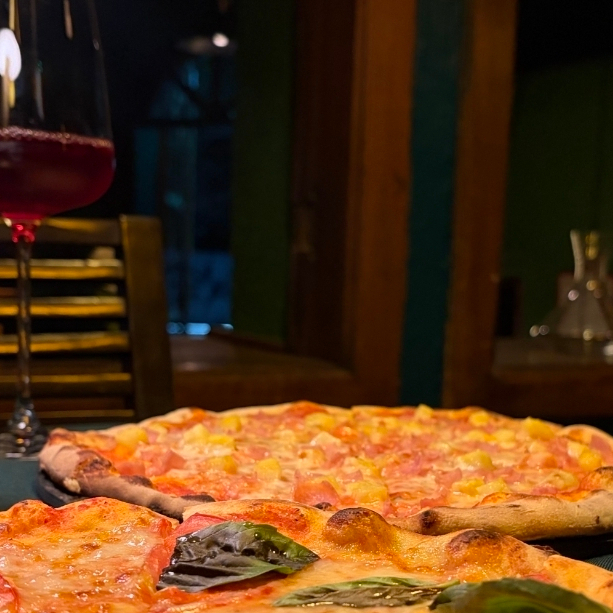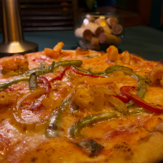 Pizza de 30 cm con base de jitomate, mozzarella y camarones salteados con pimientos, vino blanco y peperoncino.
