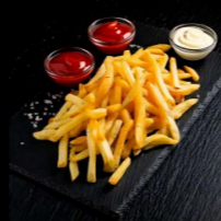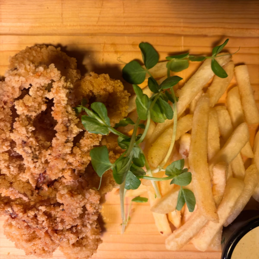 Calamares crujientes en panko (150 g) acompañados de papas a la francesa y salsa arrabiata.