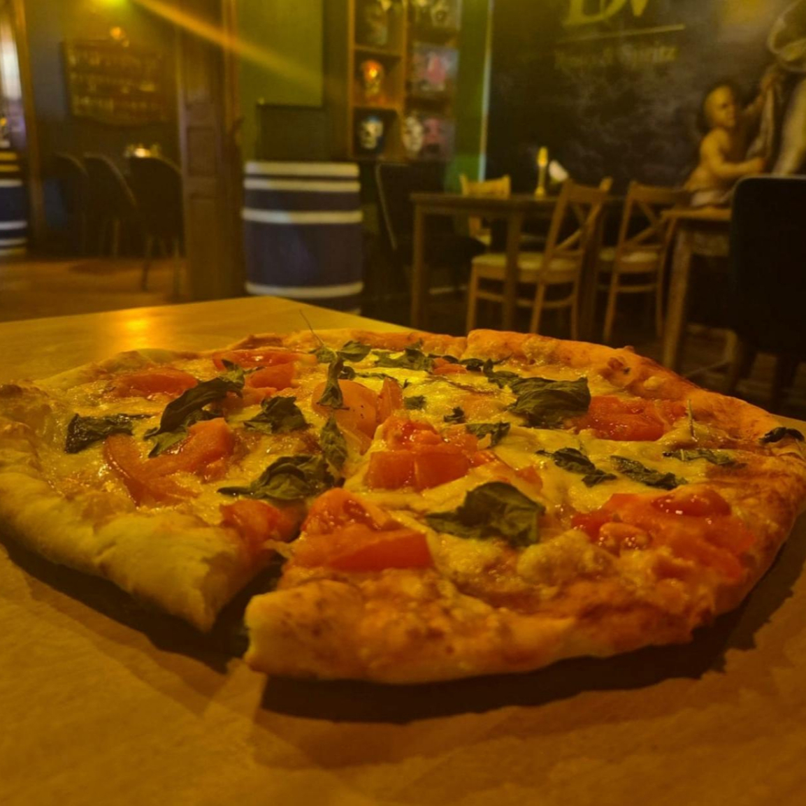 Pizza de 30 cm con base de jitomate, queso mozzarella, jitomate fresco, albahaca y parmesano.