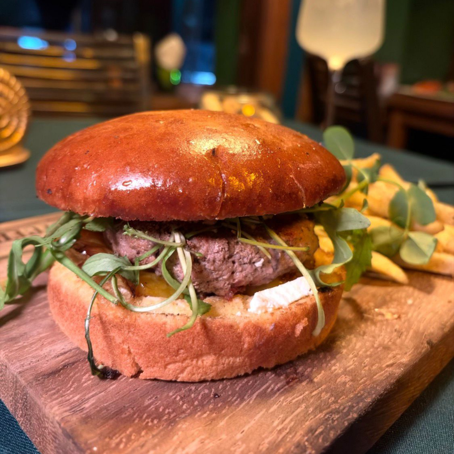 Hamburguesa de res (150 g) con queso de cabra, pesto, lechuga, cebolla y jitomate, acompañada de papas a la francesa.