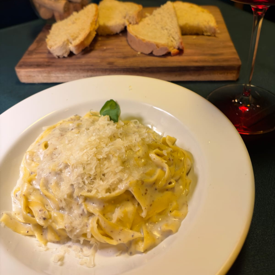 Pasta fresca hecha en casa (200 g) con salsa bechamel, toque de trufa y parmesano, coronada con almendra tostada fileteada.