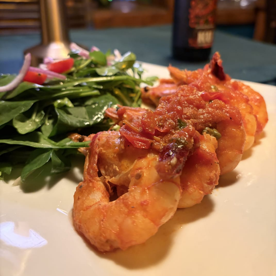 200 g De camarones con cabeza en una salsa a base de pomodoro, fondo de camarón, alcaparras, limón real y un toque de chile de árbol acompañado con ensalada.