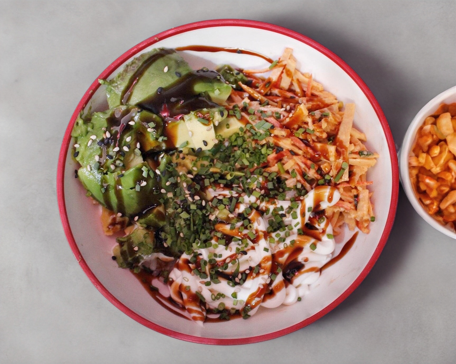 Arroz al vapor con aguacate, philadelphia, ensalada maki y un toque de salsa de anguila.