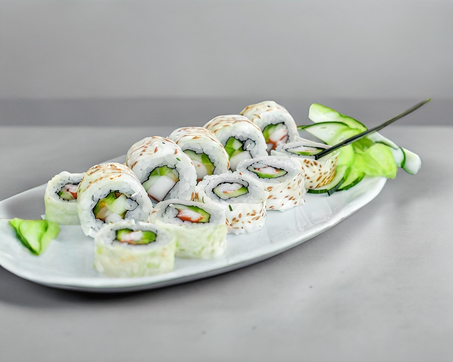 Philadelphia por fuera, pepino, zanahoria, philadelphia, aguacate. Ingrediente a elección.