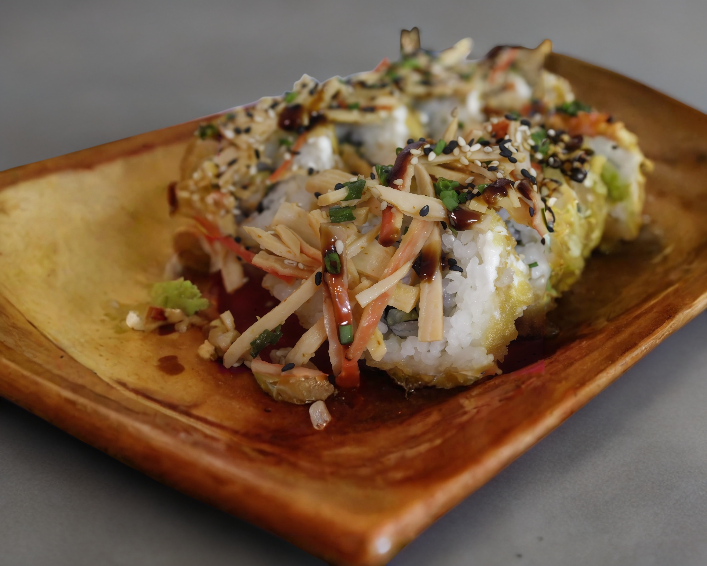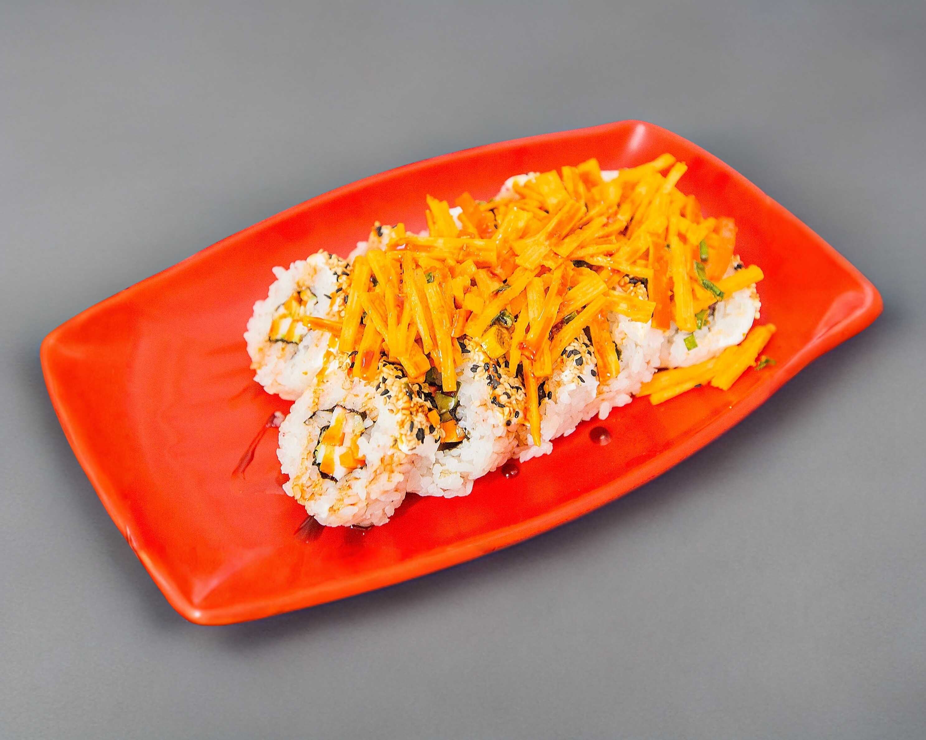 Cobertura de philadelphia, empanizado y coronado con ensalada kani y un toque de salsa de anguila.