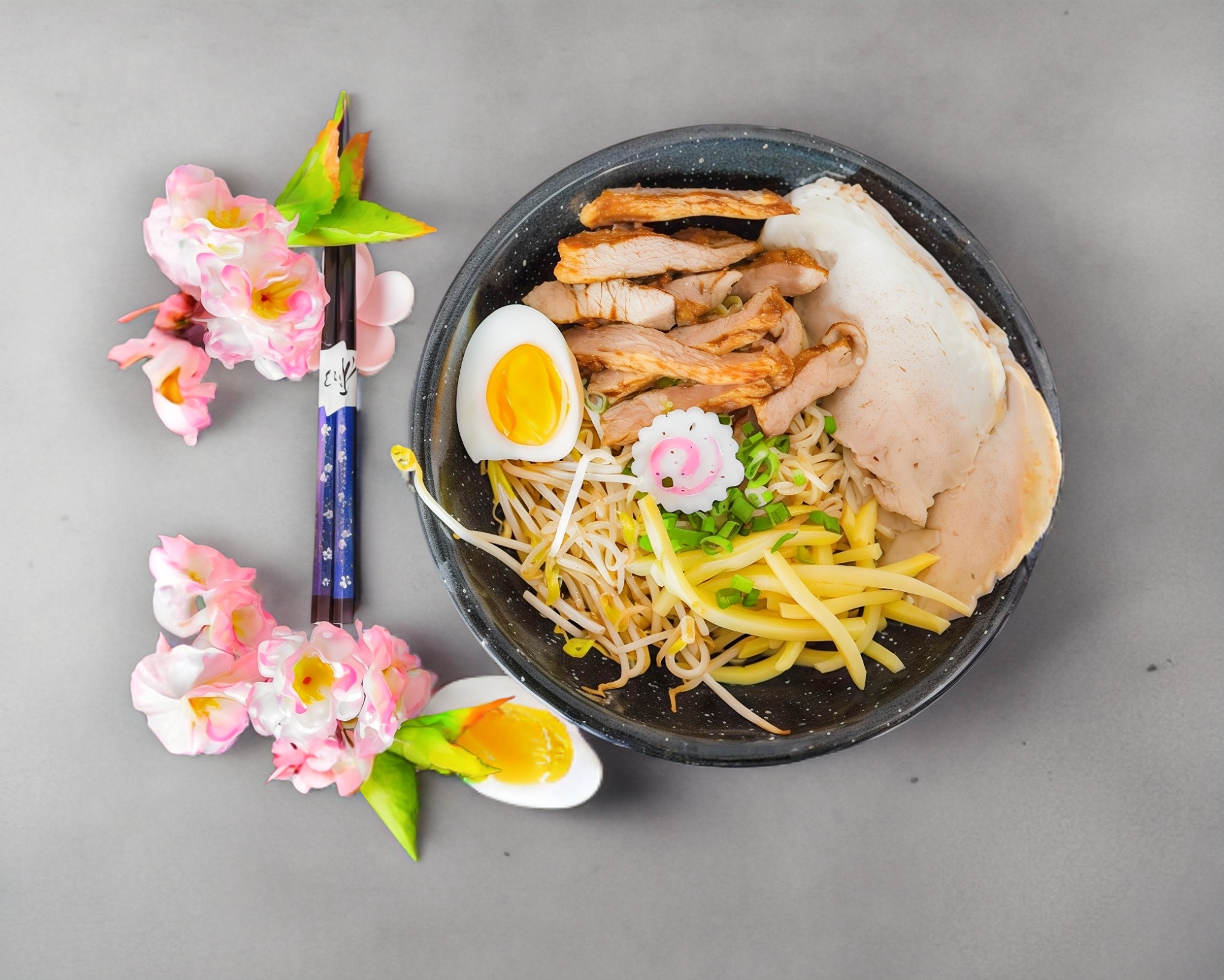 Delicioso caldo de ramen y base de soya, cebollín, huevo, champiñón fresco, pasta artesanal y un suave trozo de panceta de cerdo marinada con la receta de la casa.