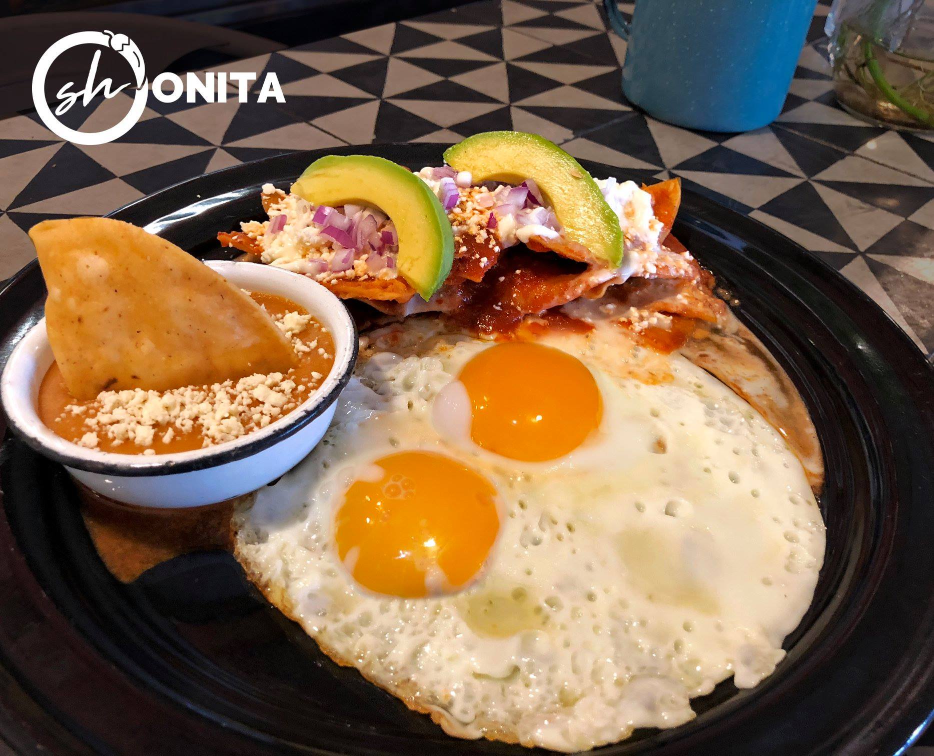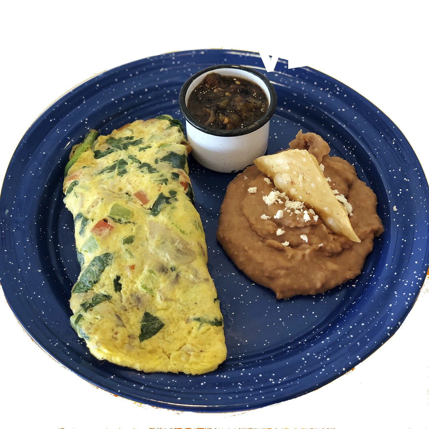 2 Huevos Estrellados o revueltos o la mexicana (Jitomate, cebolla y Shile), con frijoles naturales o puercos.