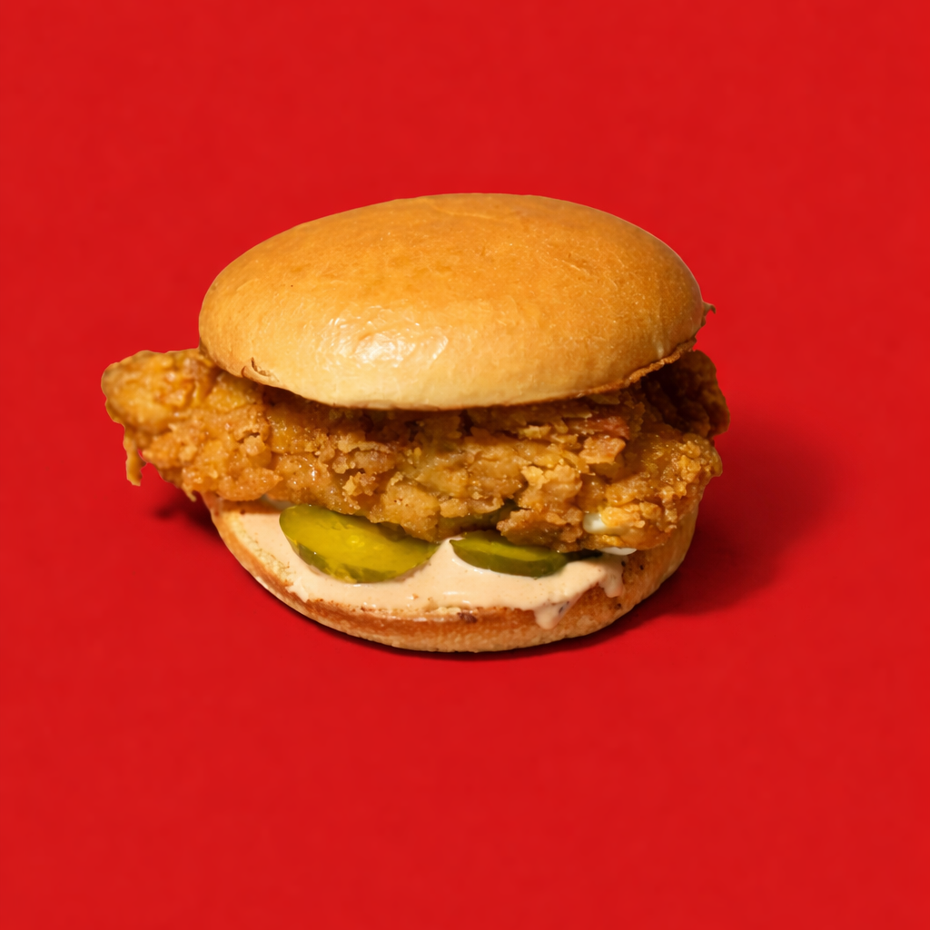 Pan de mantequilla, pechuga de pollo empanizado, pepinillos y aderezo de la casa.