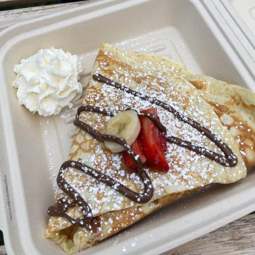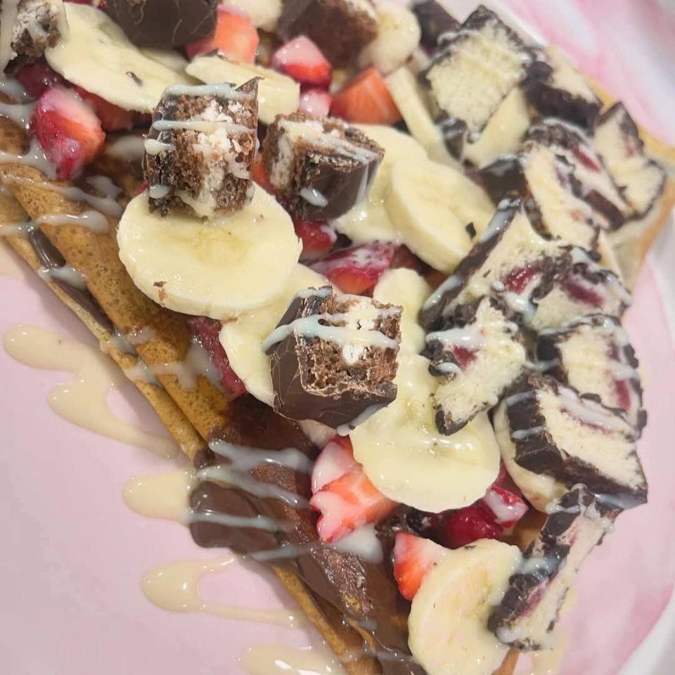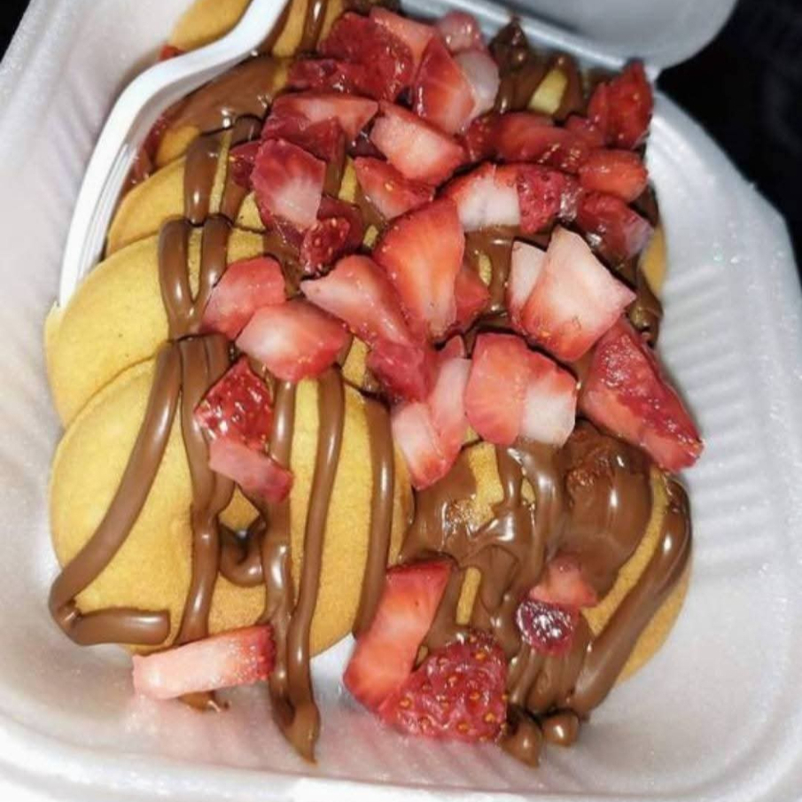 tortilla dulce bañada con nutella mermelada de fresa y filadelfia, acompañada de rica fresa natural y pedasitos de gancito