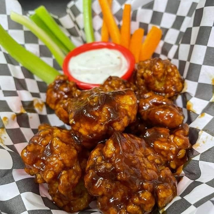 deliciosas alitas crujientes bañadas en tu salsa favorita, acompañadas de zanahoria as de