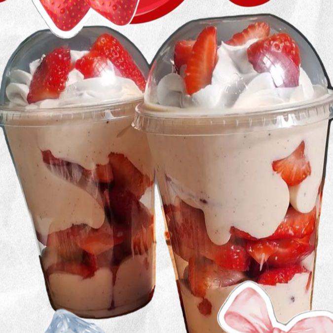 fresas naturales en vaso acompañadas de rica crema especial de la casa acompañado de rompope o kalhua a eleccion y topings