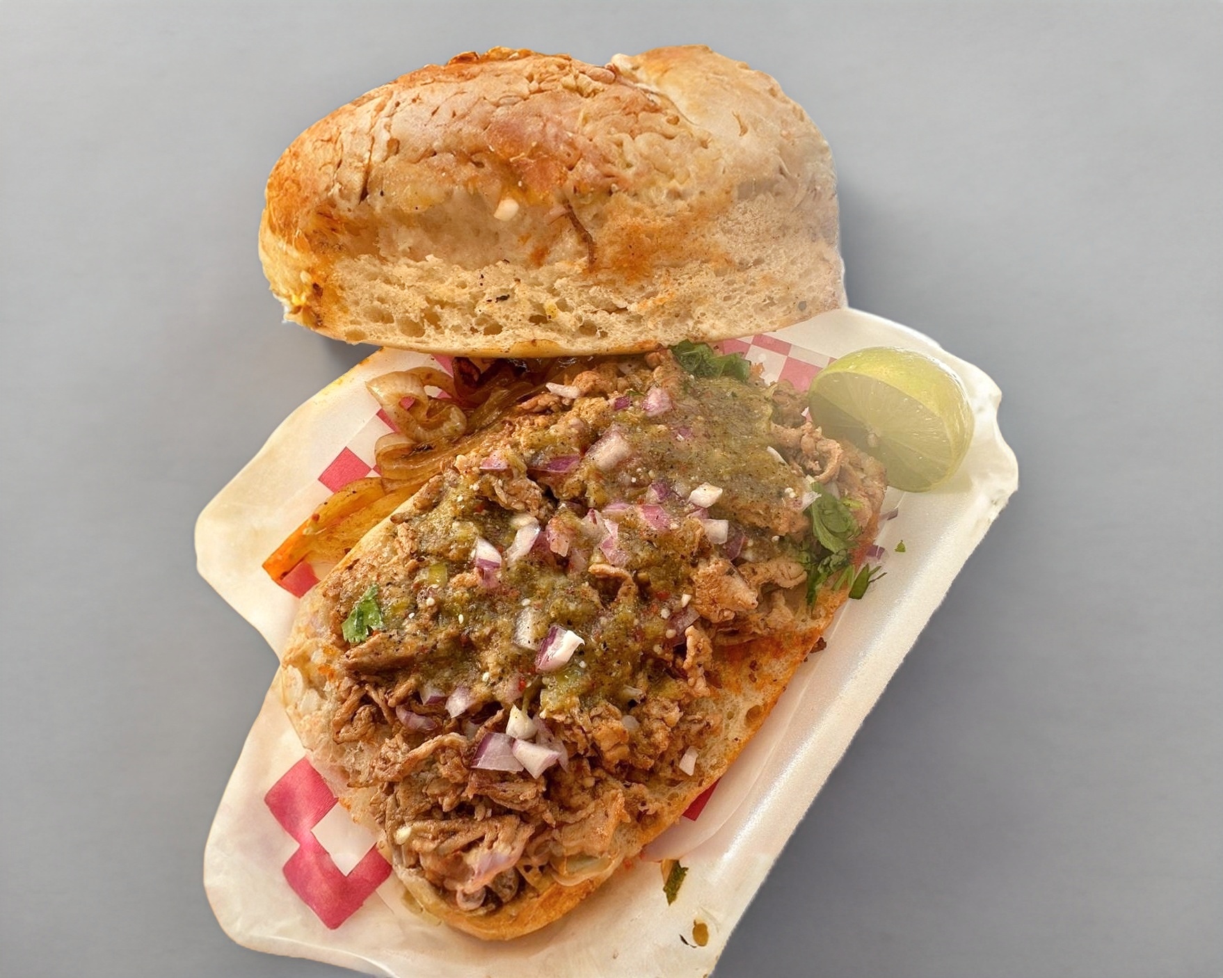 Delicioso lonche de arrachera en telera con mantequilla, acompañado de salsas, cebolla, cilantro y limon