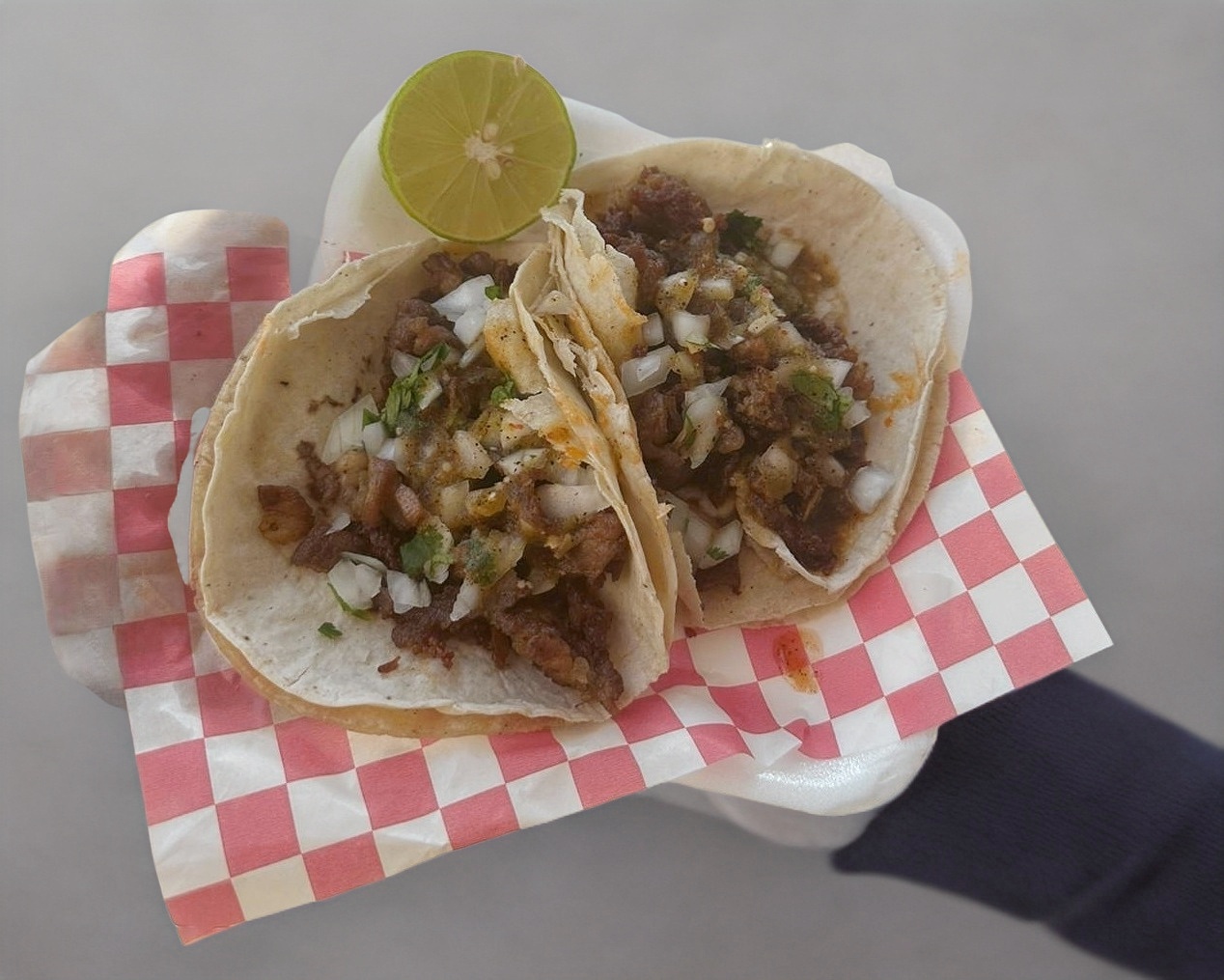 Delicioso taco de bistec con tortilla de maíz, acompañado de salsas, cebolla, cilantro y limon