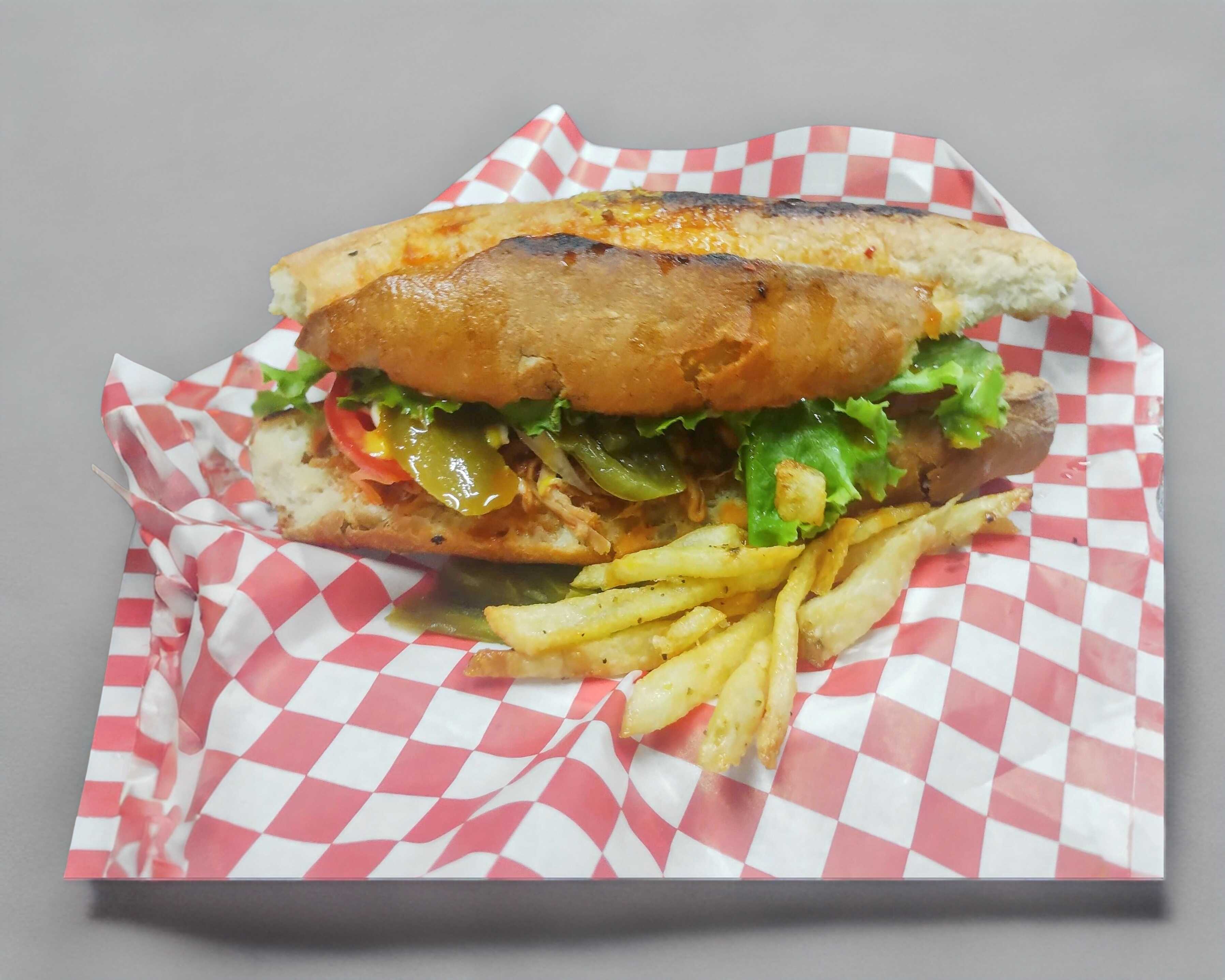 Pan, pollo, tocino, queso amarillo, ranch, búfalo, aros de cebolla, jitomate, cebolla, lechuga, pepinillos, captsu, mostaza y chiles jalapeños aparte (poner en comentarios si no quiere algún ingrediente)