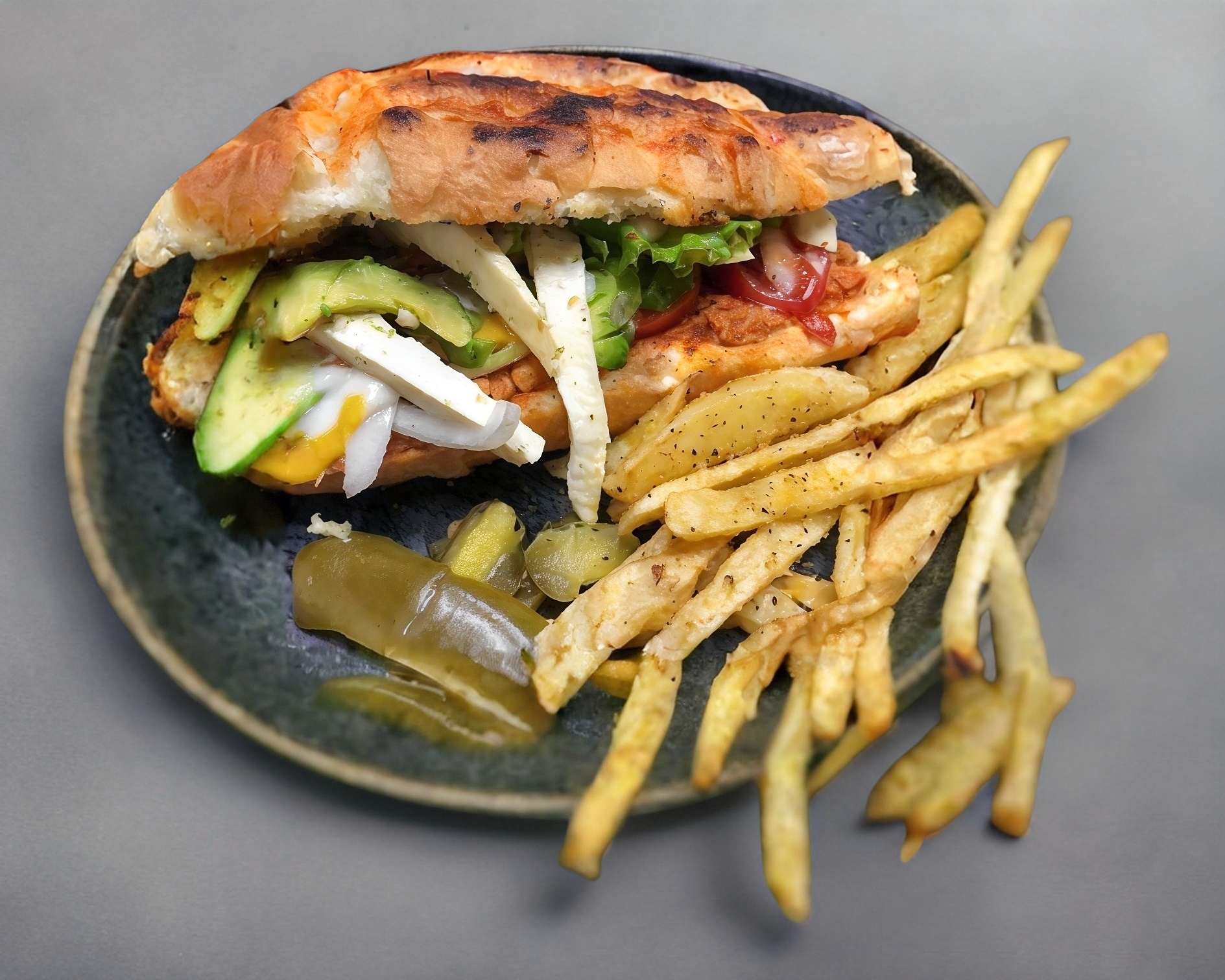 Bolillo, pierna, aguacate, panela, cebolla, jitomate, lechuga, crema, mostaza y captsu y chile jalapeño aparte(poner en comentarios si no quiere algún ingrediente)