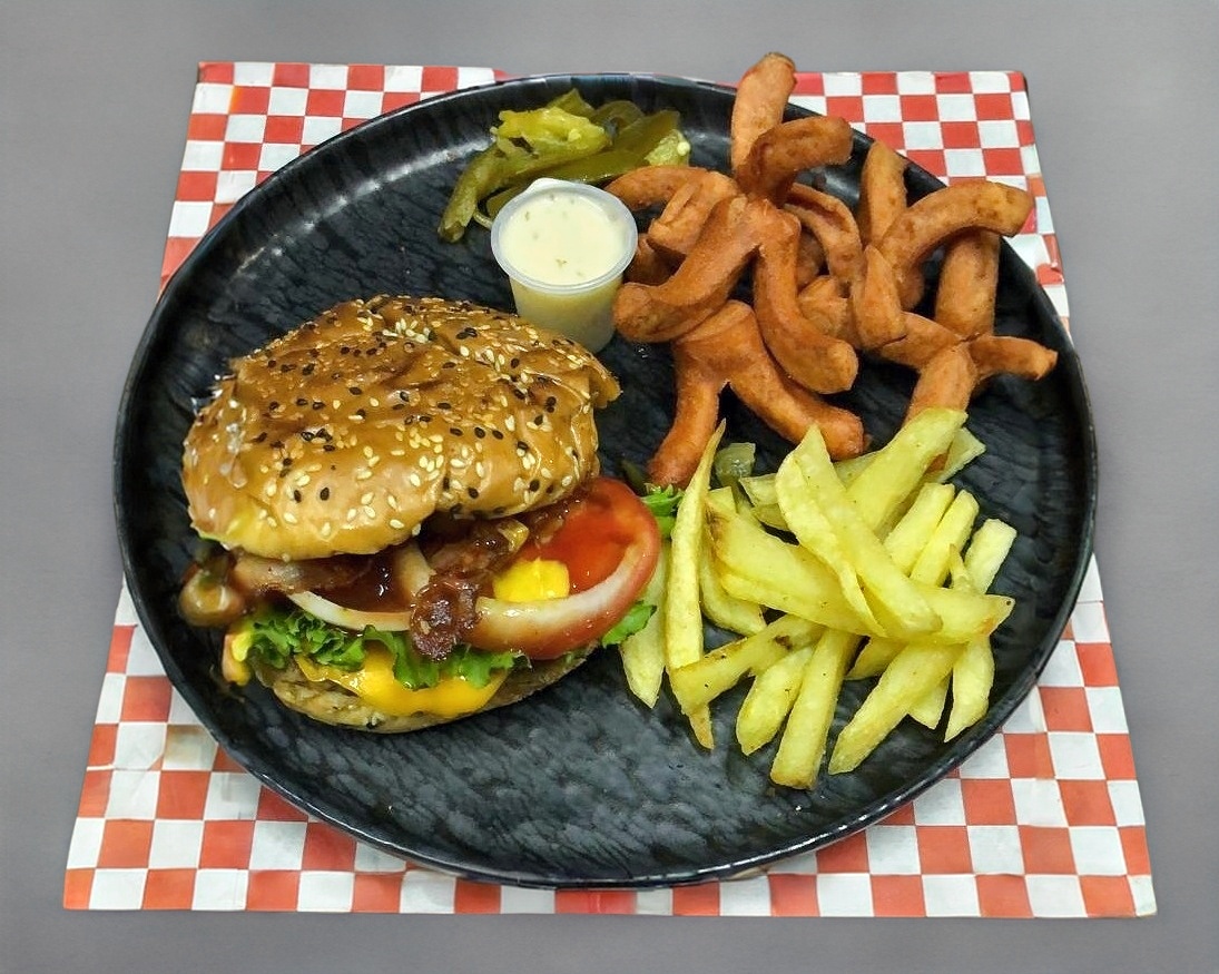 Pan, tocino, aros de cebolla, BBQ, queso amarillo, mayonesa, jitomate, cebolla, lechuga, pepinillos, captsu, mostaza y chile jalapeño aparte ( poner en comentarios si no quiere algún ingrediente)