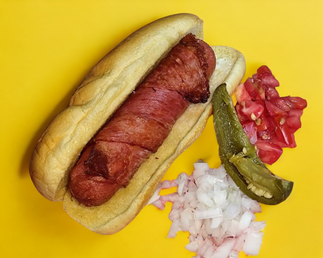 Delicioso Hot Dog con Tocino Doradito. Incluye Cebolla, Jitomate y Chile