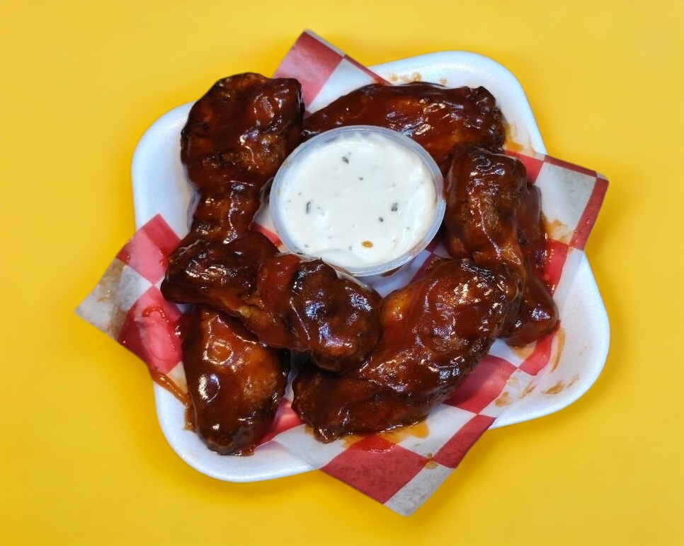 Deliciosas alitas 100% de pollo fresco (No usamos productos congelados) Bañadas en tu salsa favorita. Incluyen Aderezo Ranch