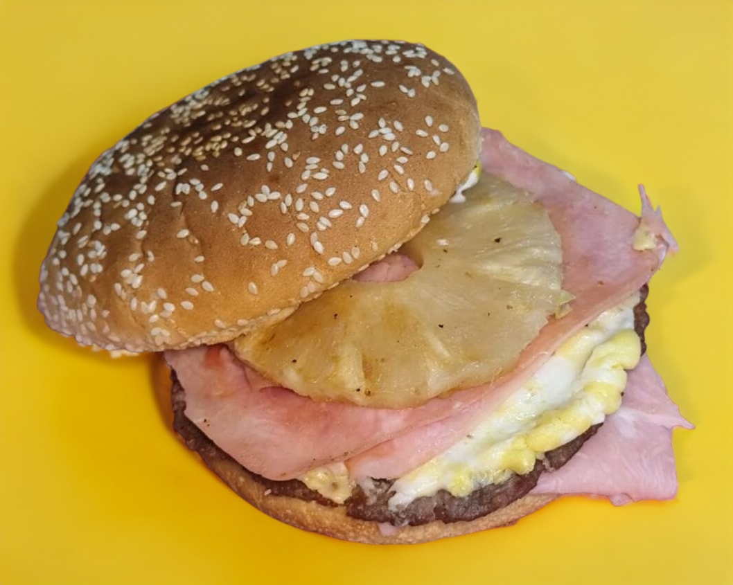 Hamburguesa de Res con Piña y Jamón. Incluye Cebolla, Jitomate y Lechuga