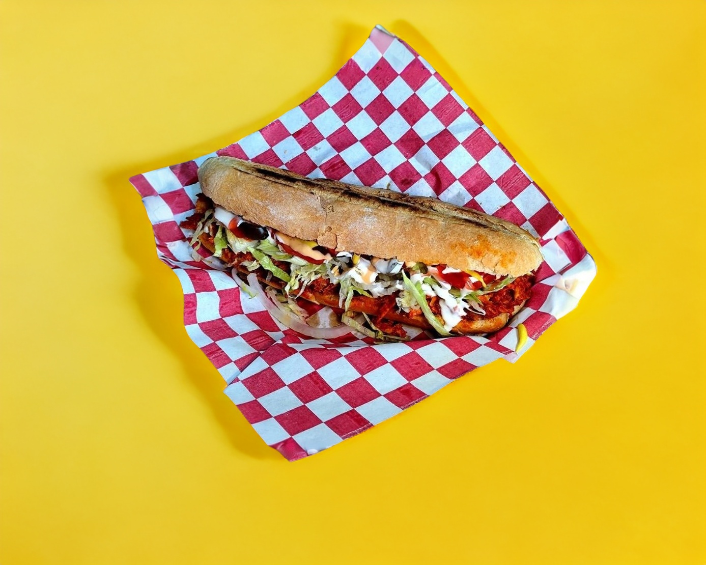Incluye Aderezo Chipotle, Lechuga, Jitomate, Cebolla y Chile. Acompañado con Crema, Catsup y Mostaza