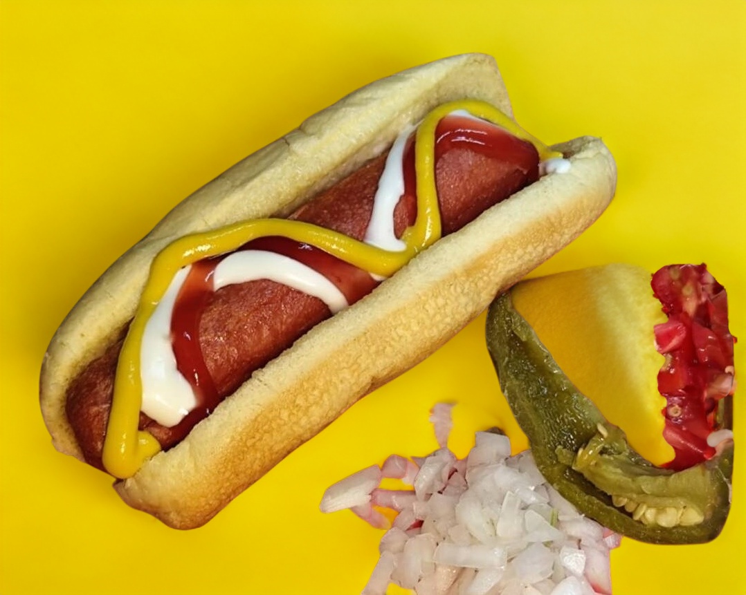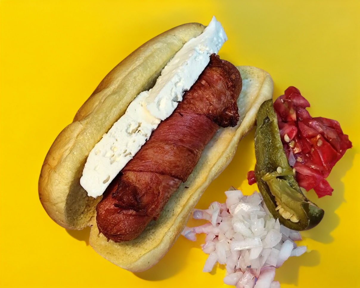 Delicioso Hot Dog con Panel Fresca y Tocino Doradito. Incluye Cebolla, Jitomate y Chile