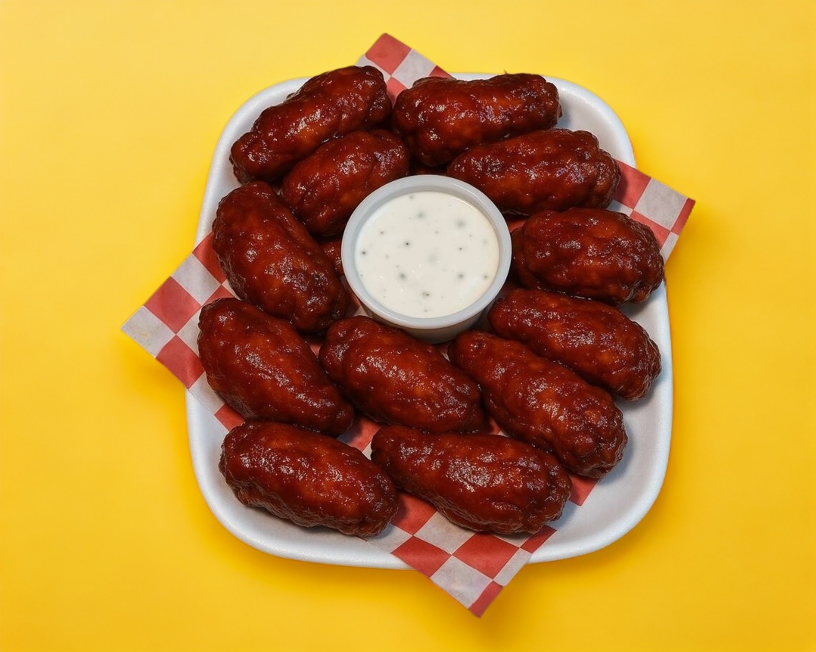 Grandotes y carnosos. Bañados en tu salsa favorita. Incluyen Aderezo Ranch