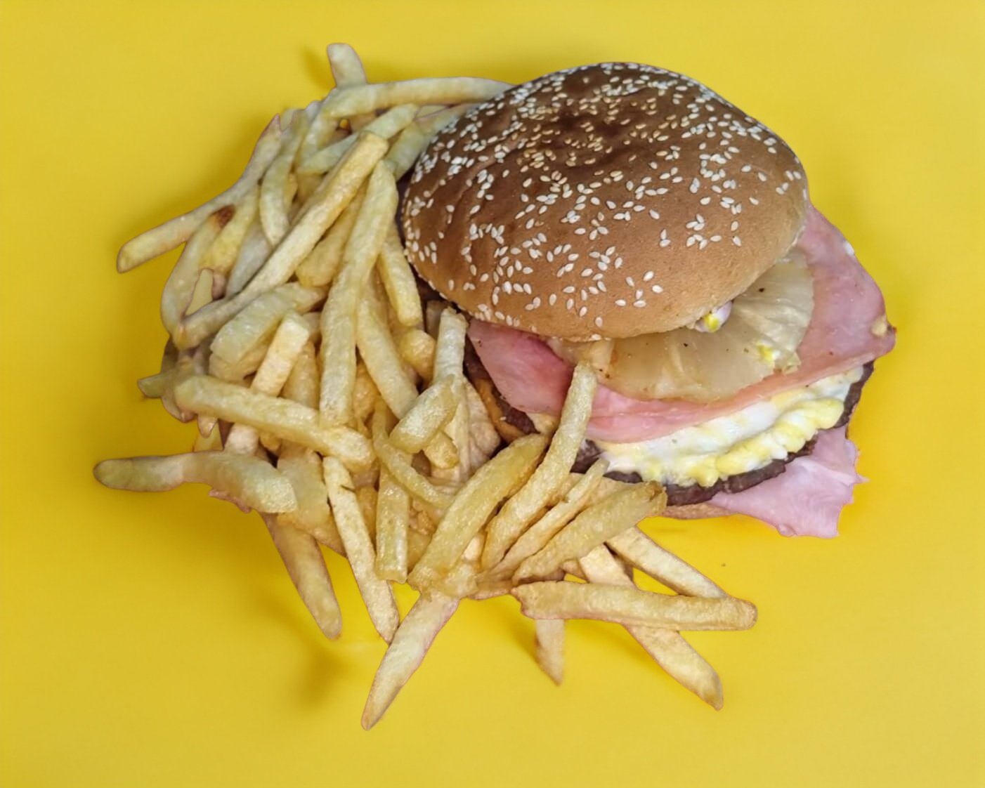 Hamburguesa Hawaiana (Lechuga, Jitomate y Cebolla) con Papas a la Francesa