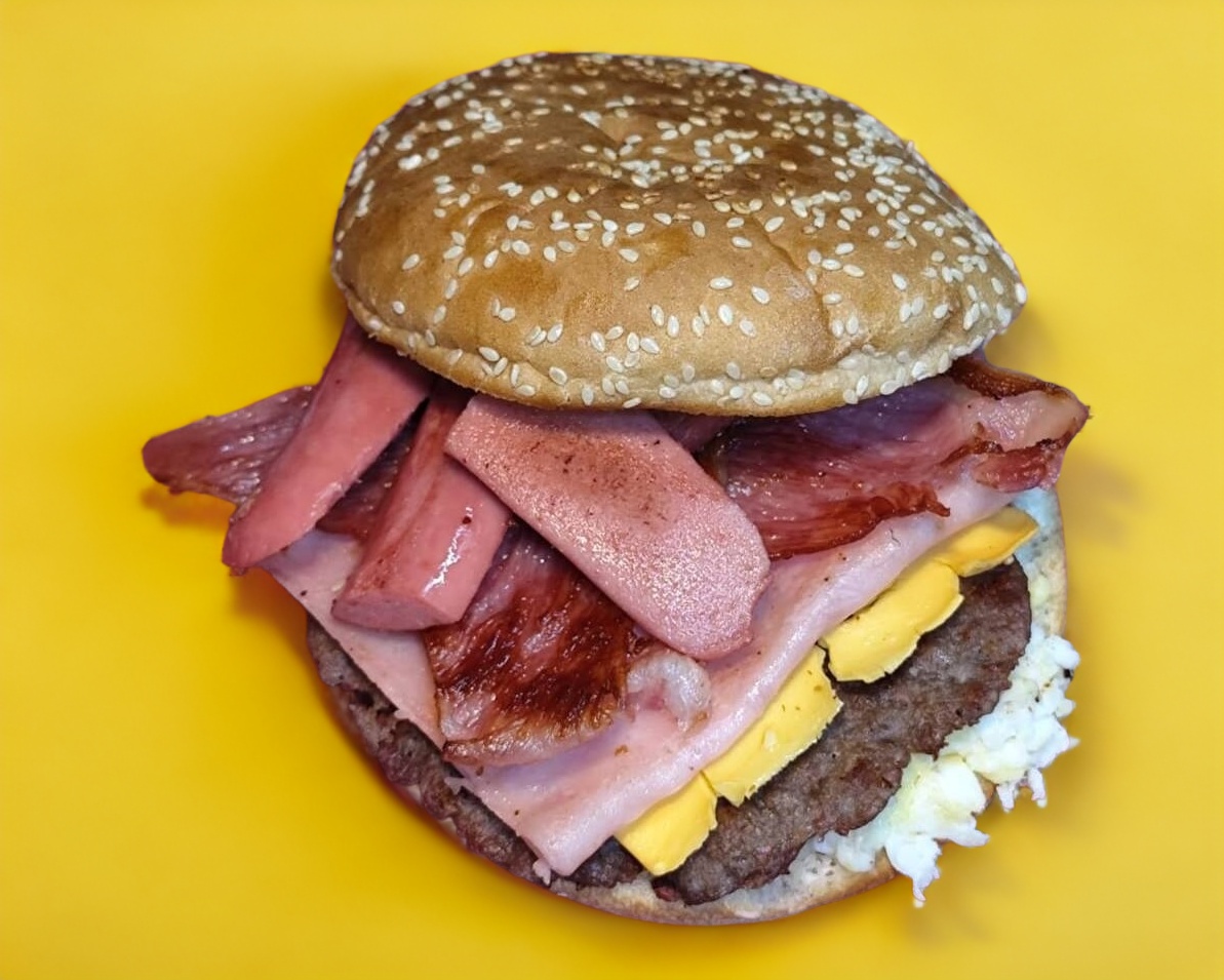 Hamburguesa de Res con Tocino, Salchicha, Queso y Jamón. Incluye Cebolla, Jitomate y Lechuga