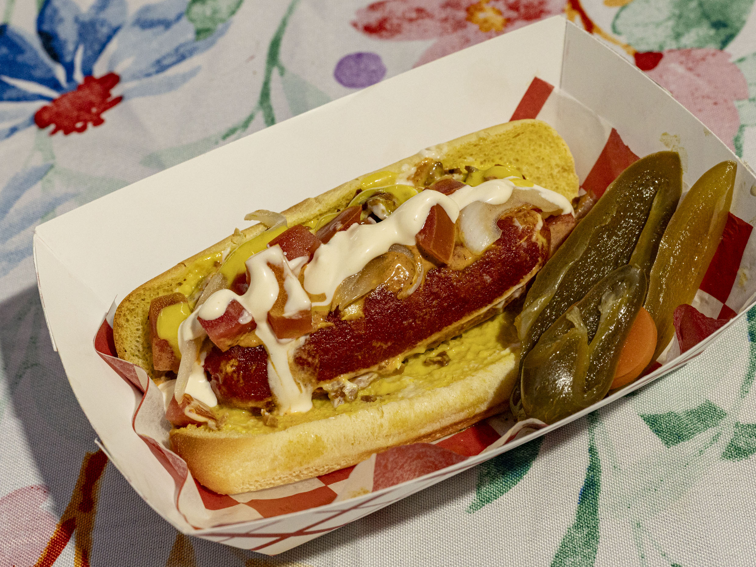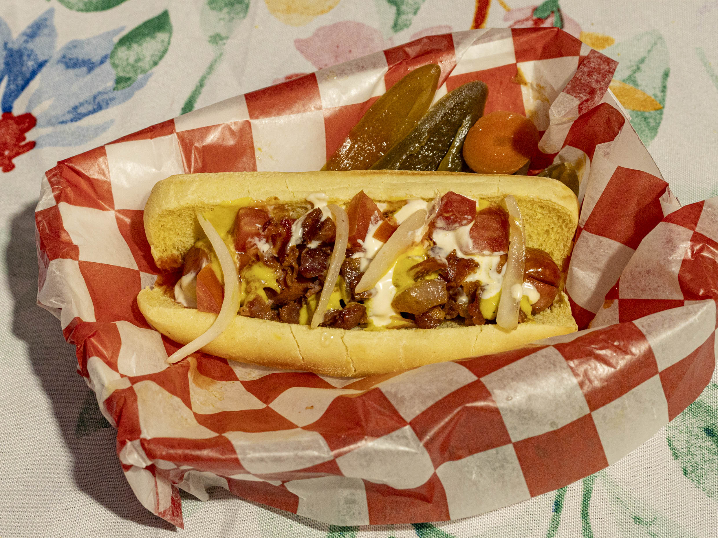 Salchicha de pavo, panela, jitomate, cebolla guisada, catsup y mostaza