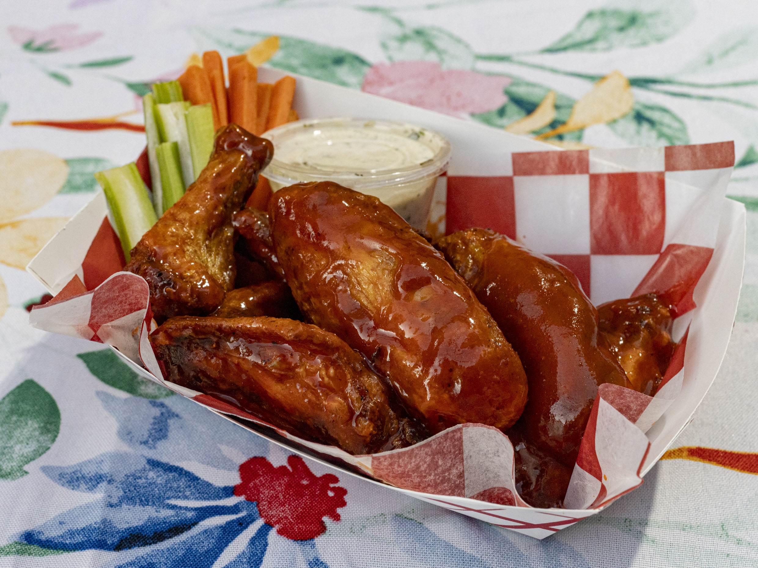 Alitas, sabor al gusto (BBQ, Buffalo, BBQ HOT, Lemon Peper, Cajún o Extra Hot), verduras y aderezo.