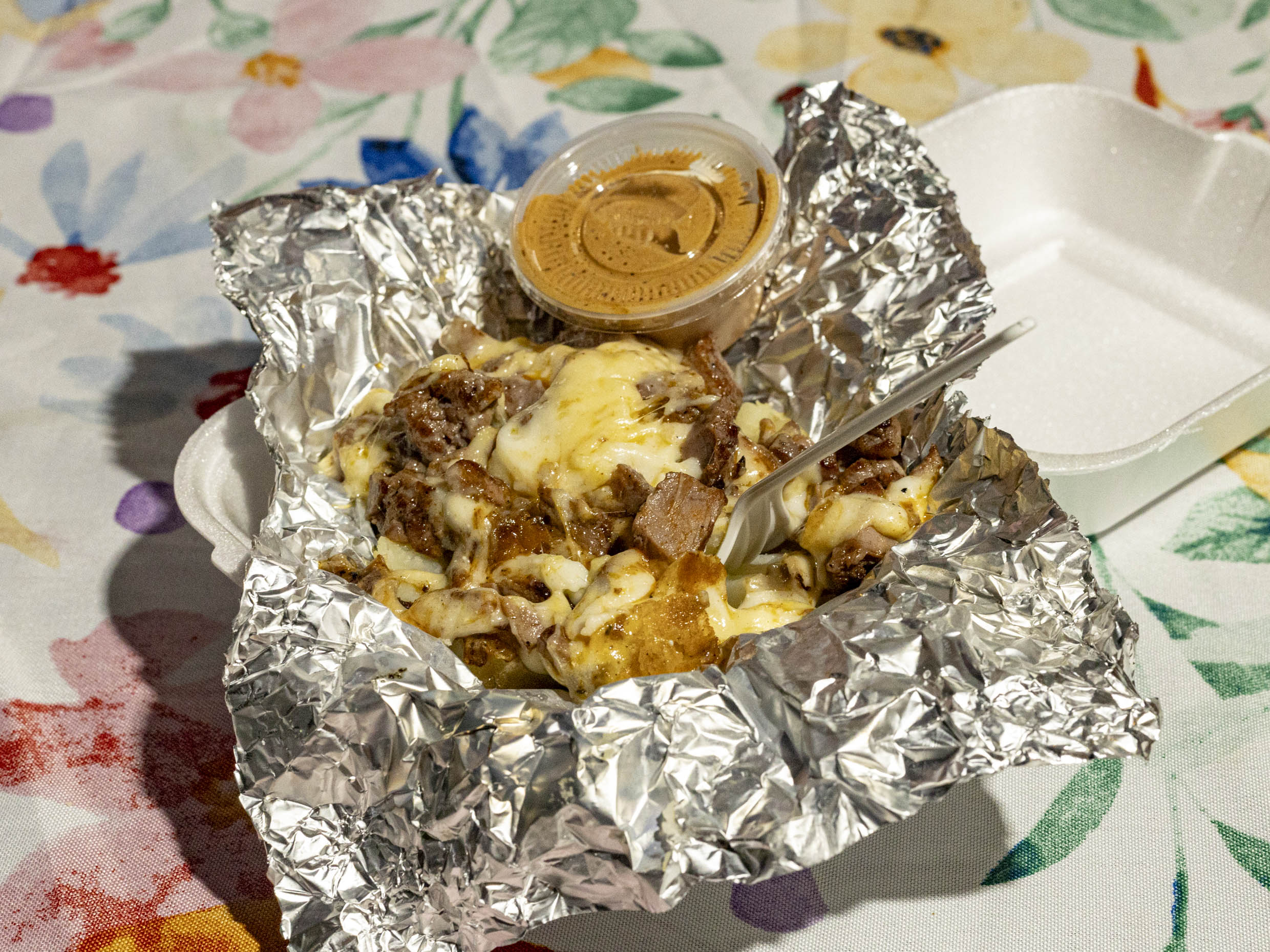 Papa al horno, 2 ingredientes al gusto (Arrachera, Chorizo, Tocino, Jamón, Champiñones o Piña), queso fundido y aderezo.
