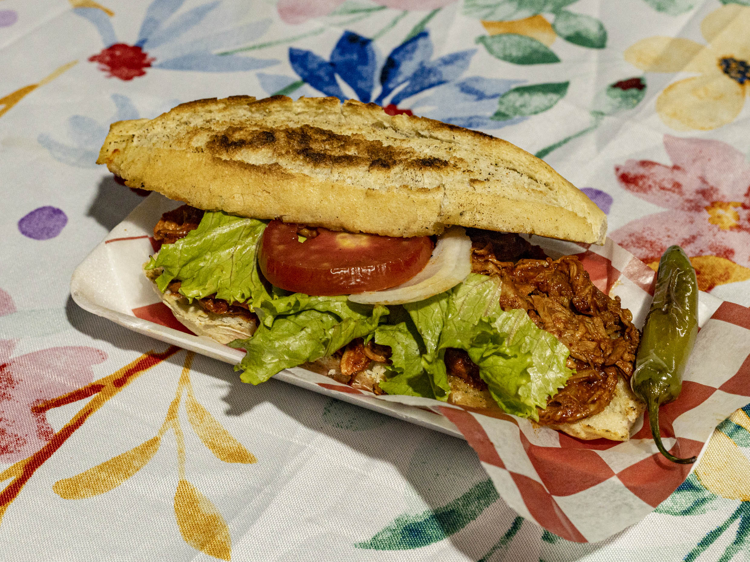 Lonche de pastor con lechuga, jitomate, cebolla frita, catsup, mostaza, crema y adereso de chipotle