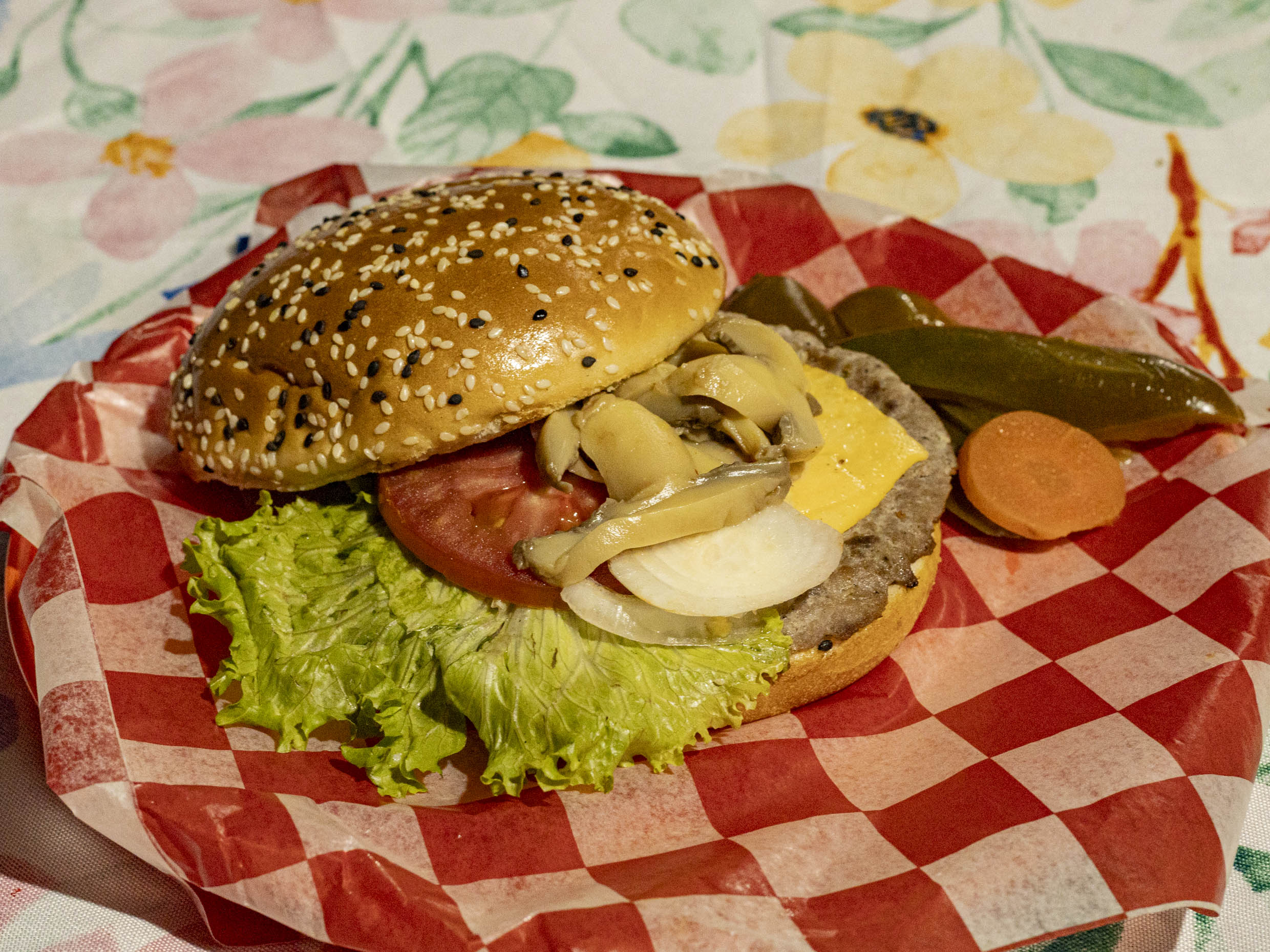 Con pan parrillero, queso derretido, champiñones, catsup y mostaza.