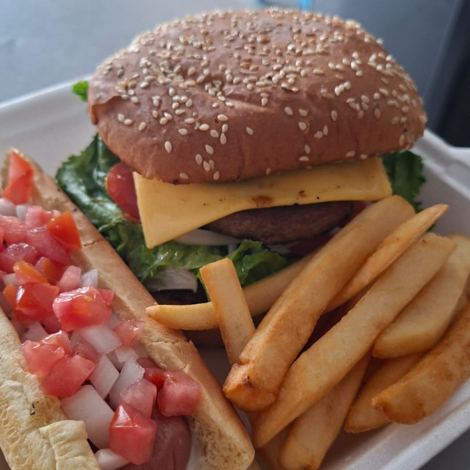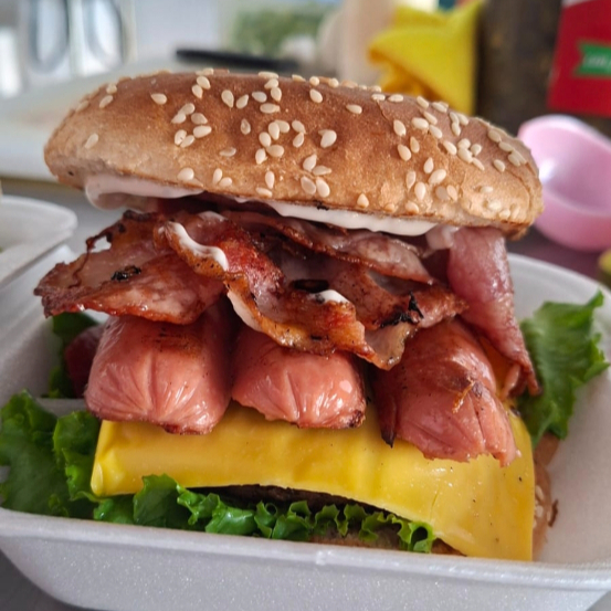 Carne de res, salchicha,tocino,lechuga, jitomate, cebolla y queso americano