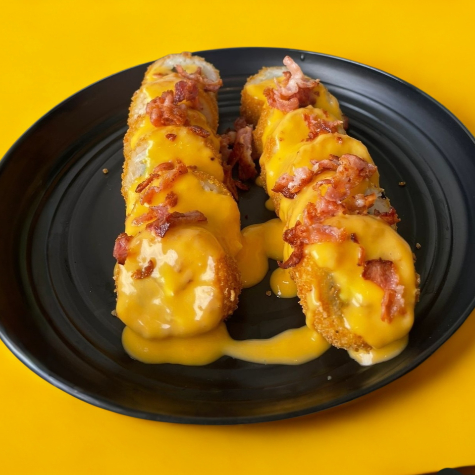 Rollo empanizado con queso gratinado y topping de tocino crocante. Por dentro: vegetales,philadelphia y proteina.