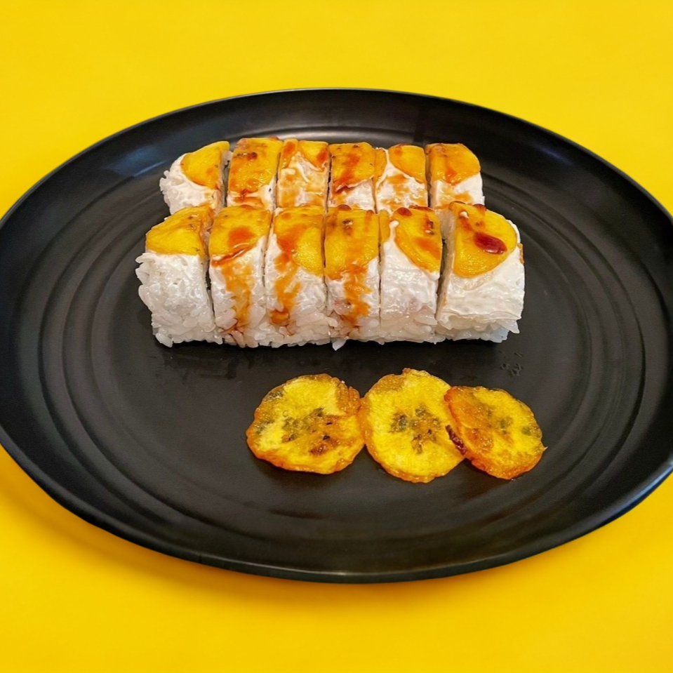 Rollo forrado de platano frito con un toque de salsa de angula. Por dentro vegetales,philadelphia y proteina