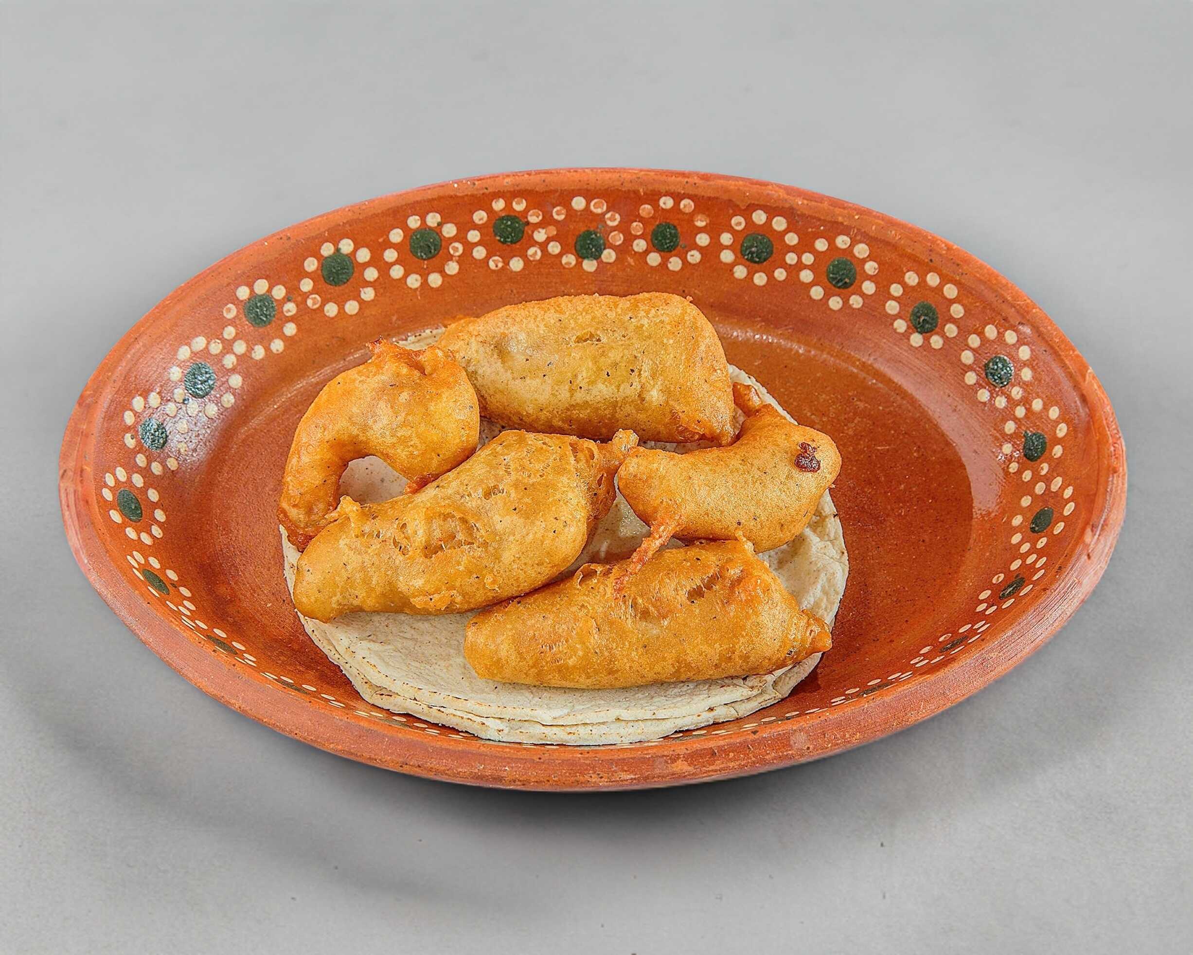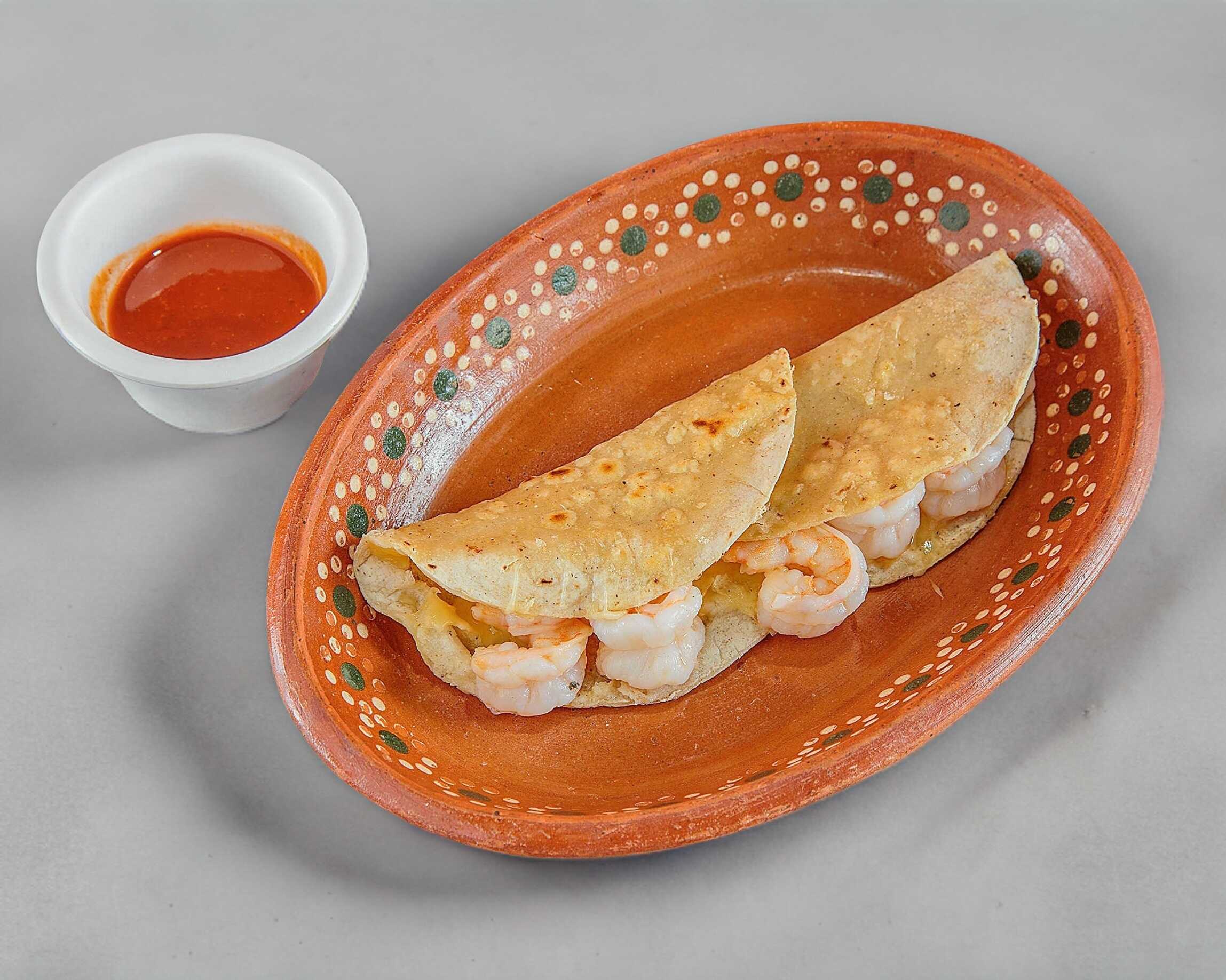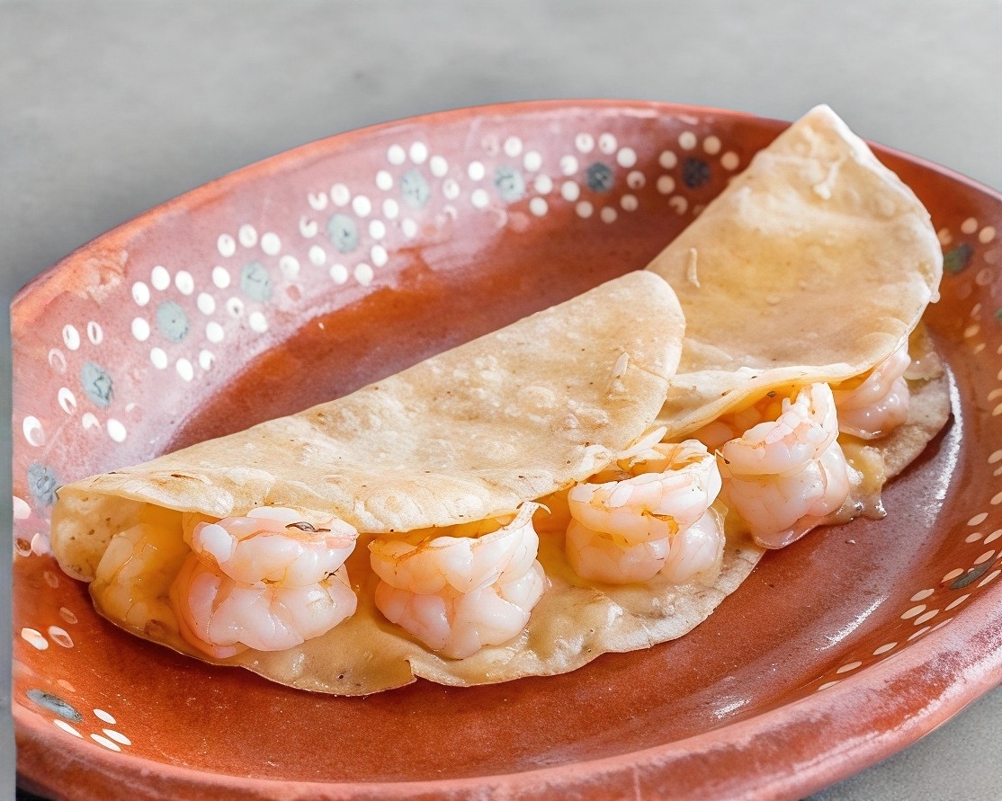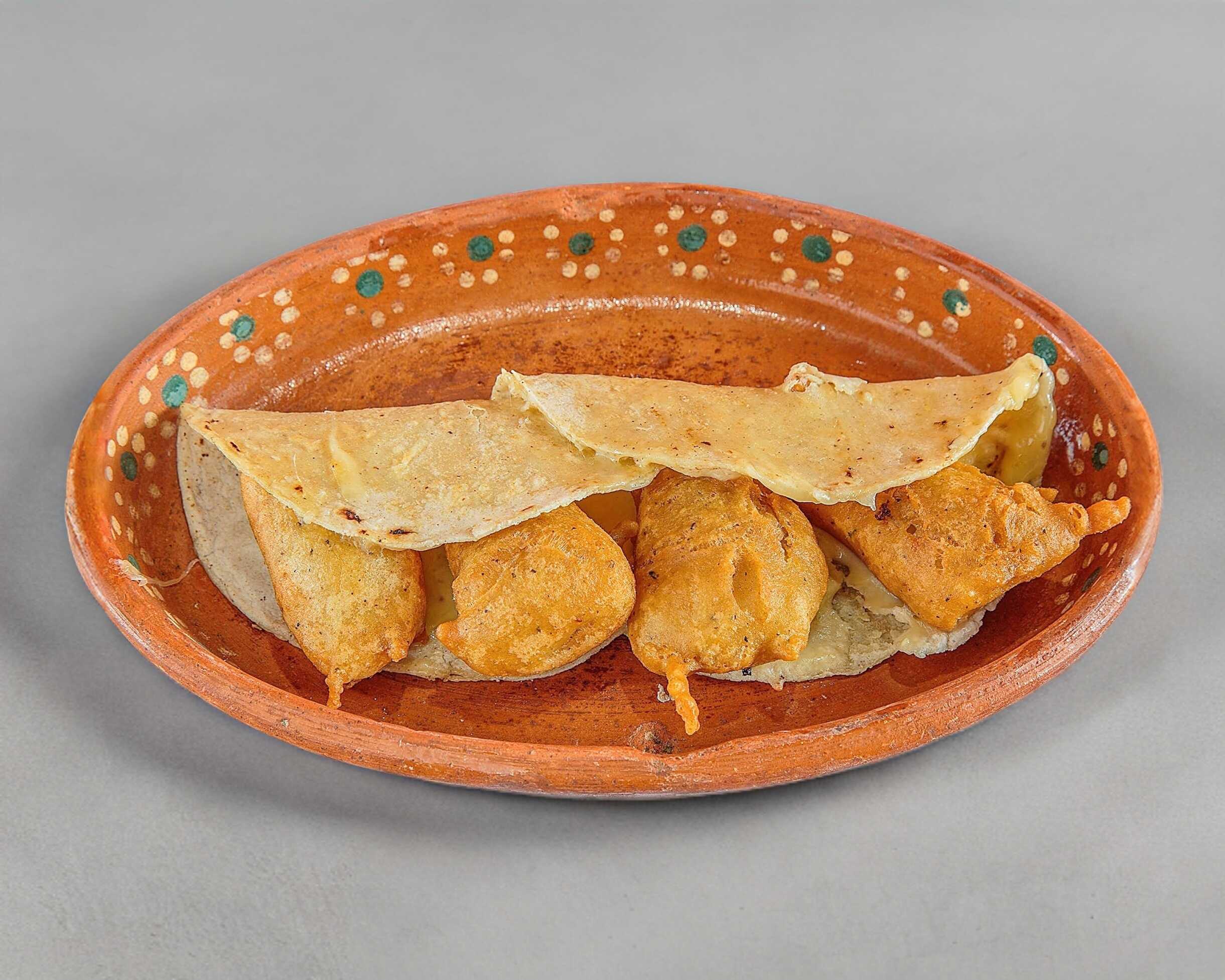 Doble tortilla con queso y camarón capeado.