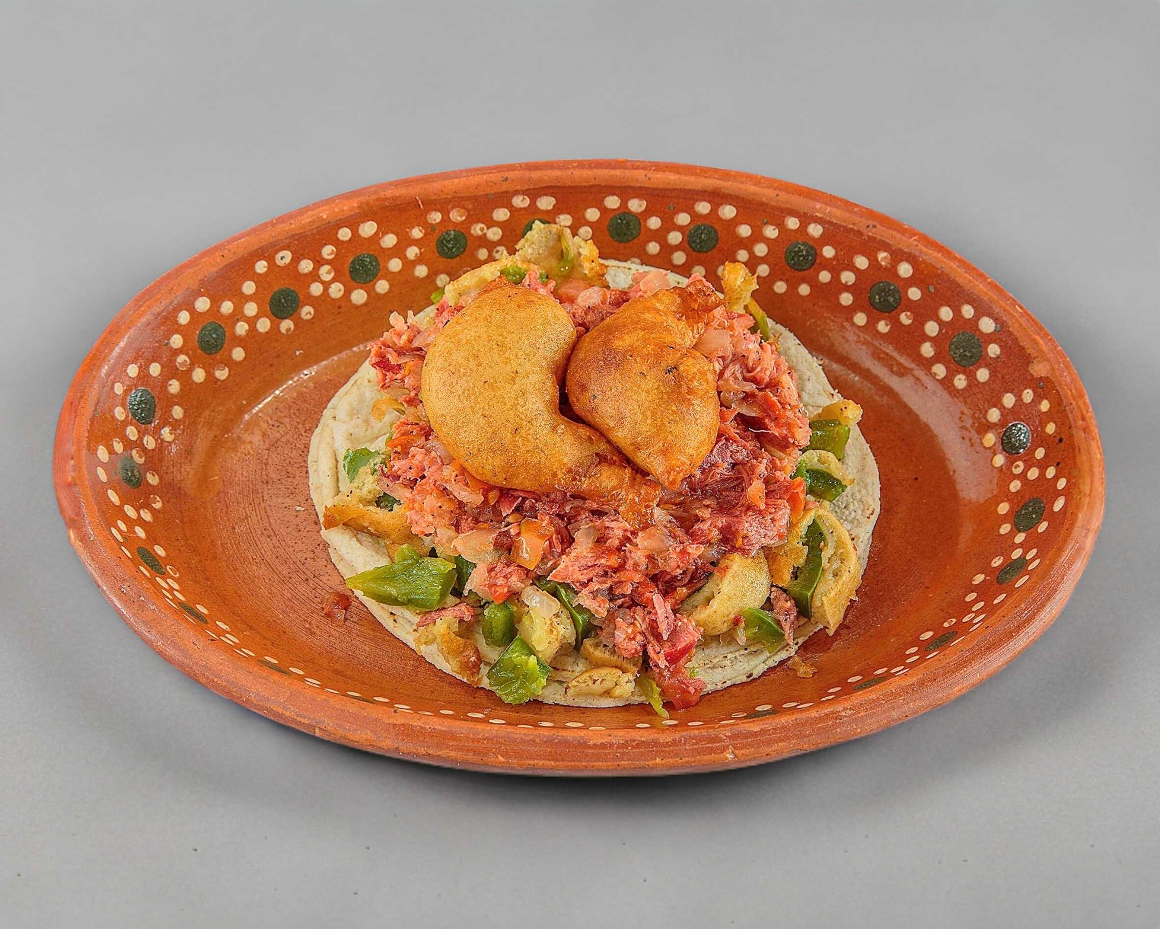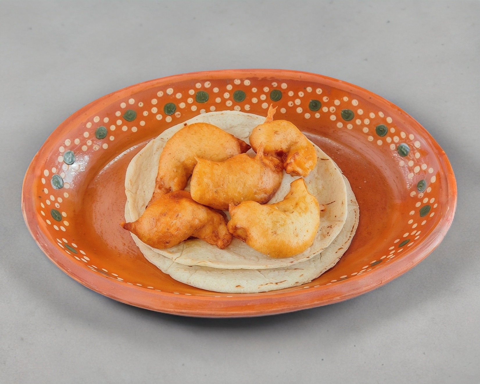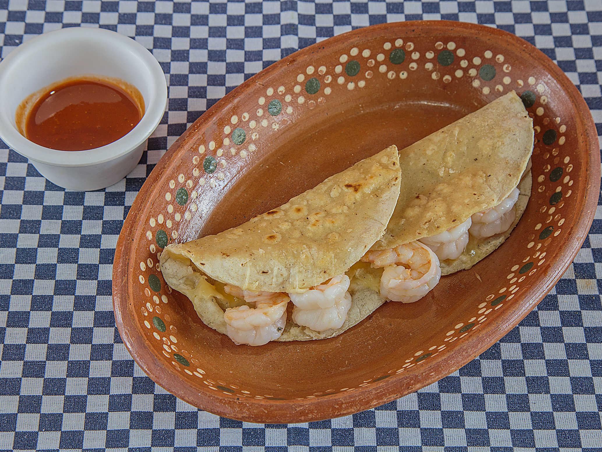 Doble tortilla con queso y camarón capeado.