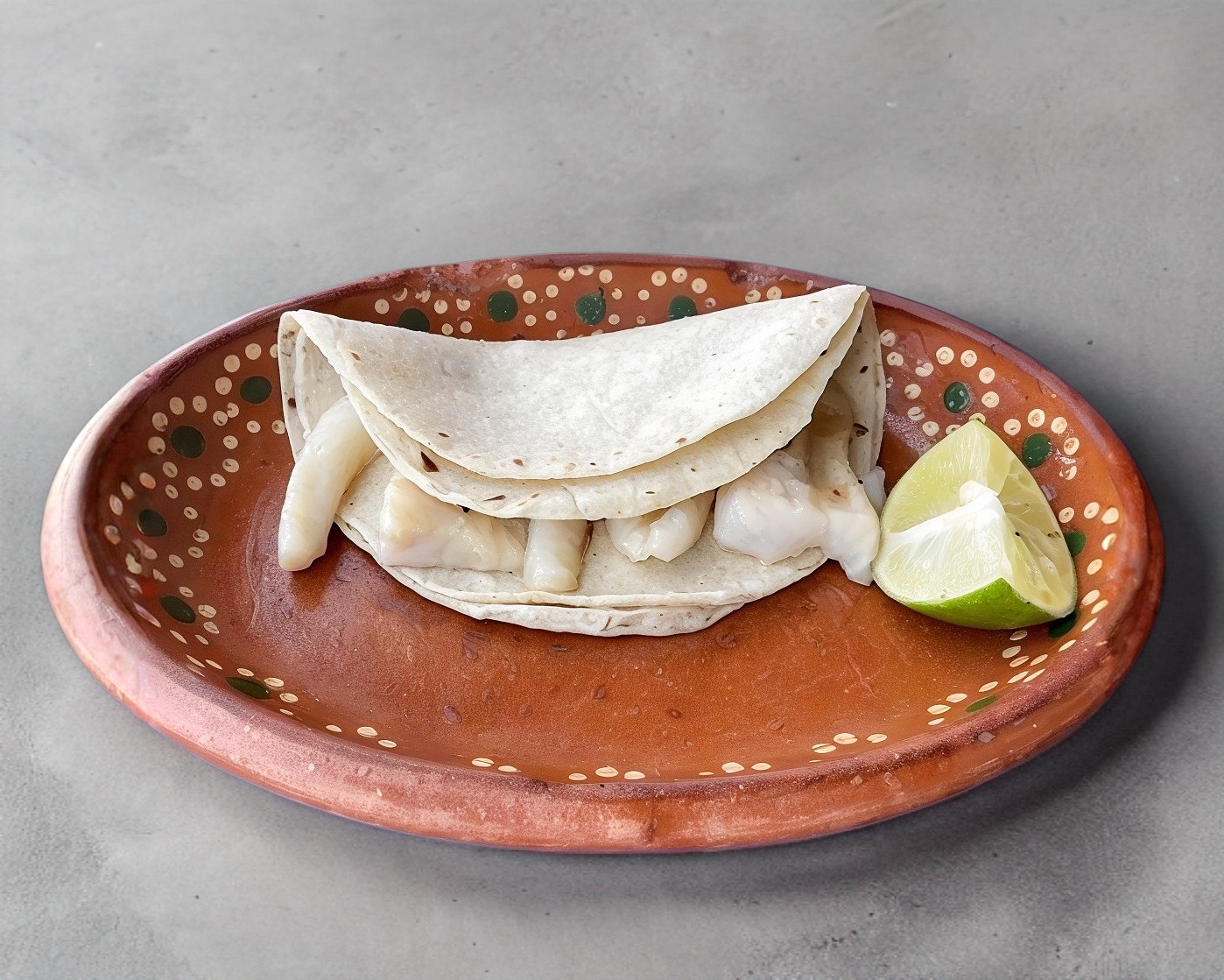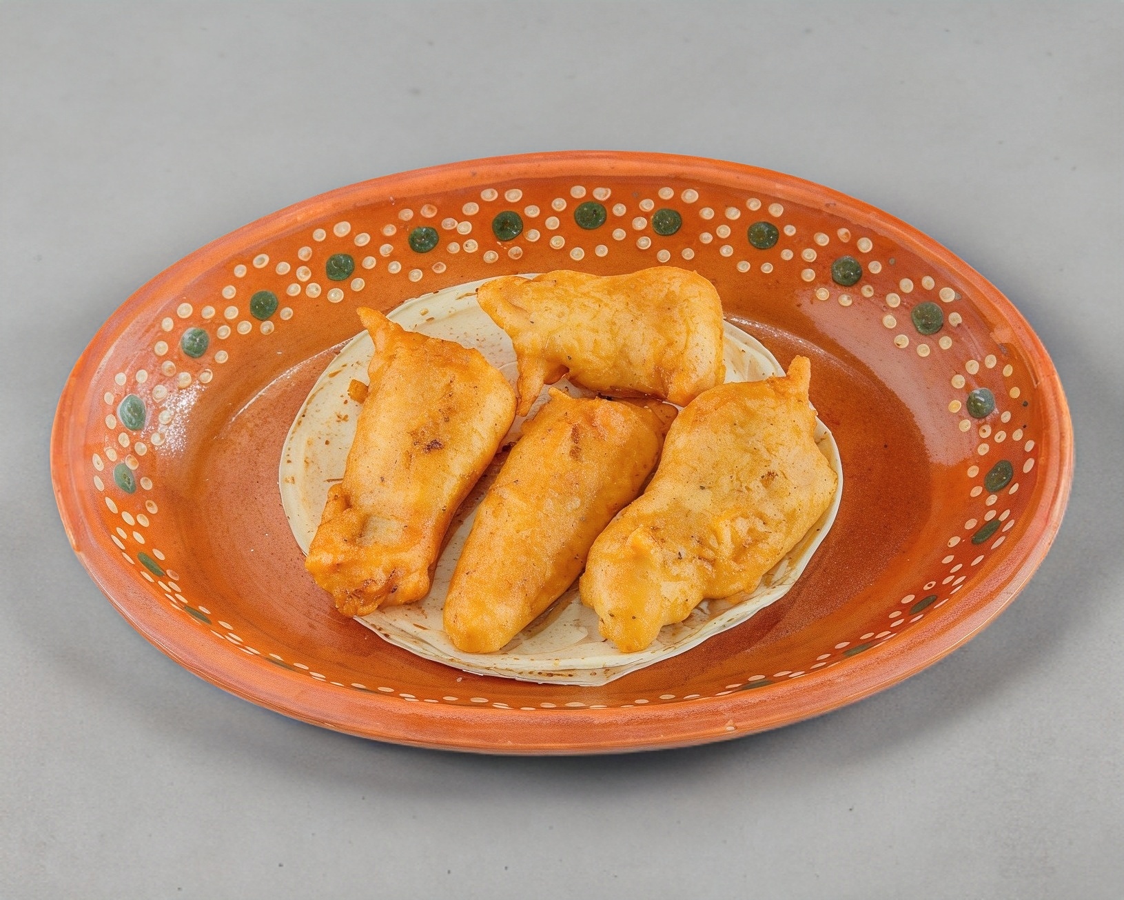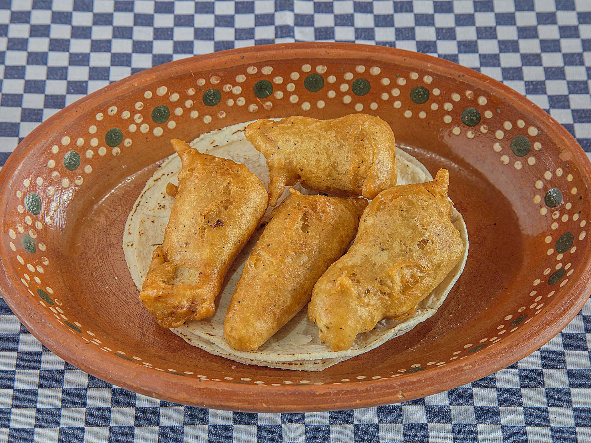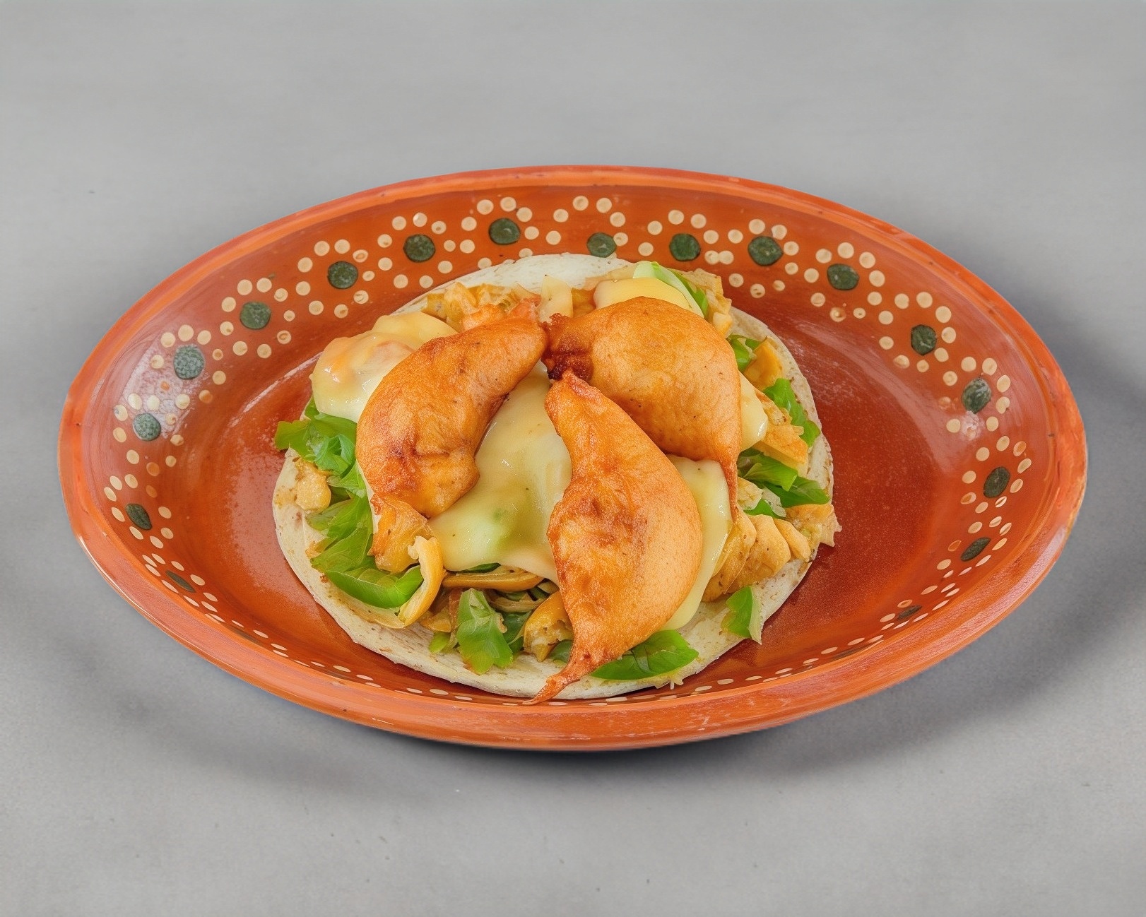 Doble tortilla con queso y camarón capeado.