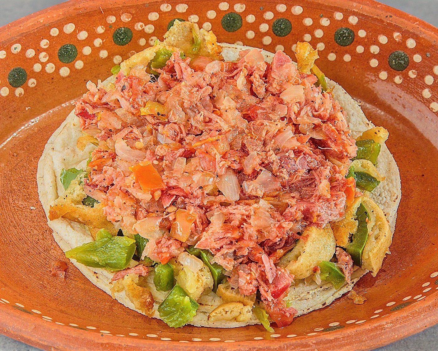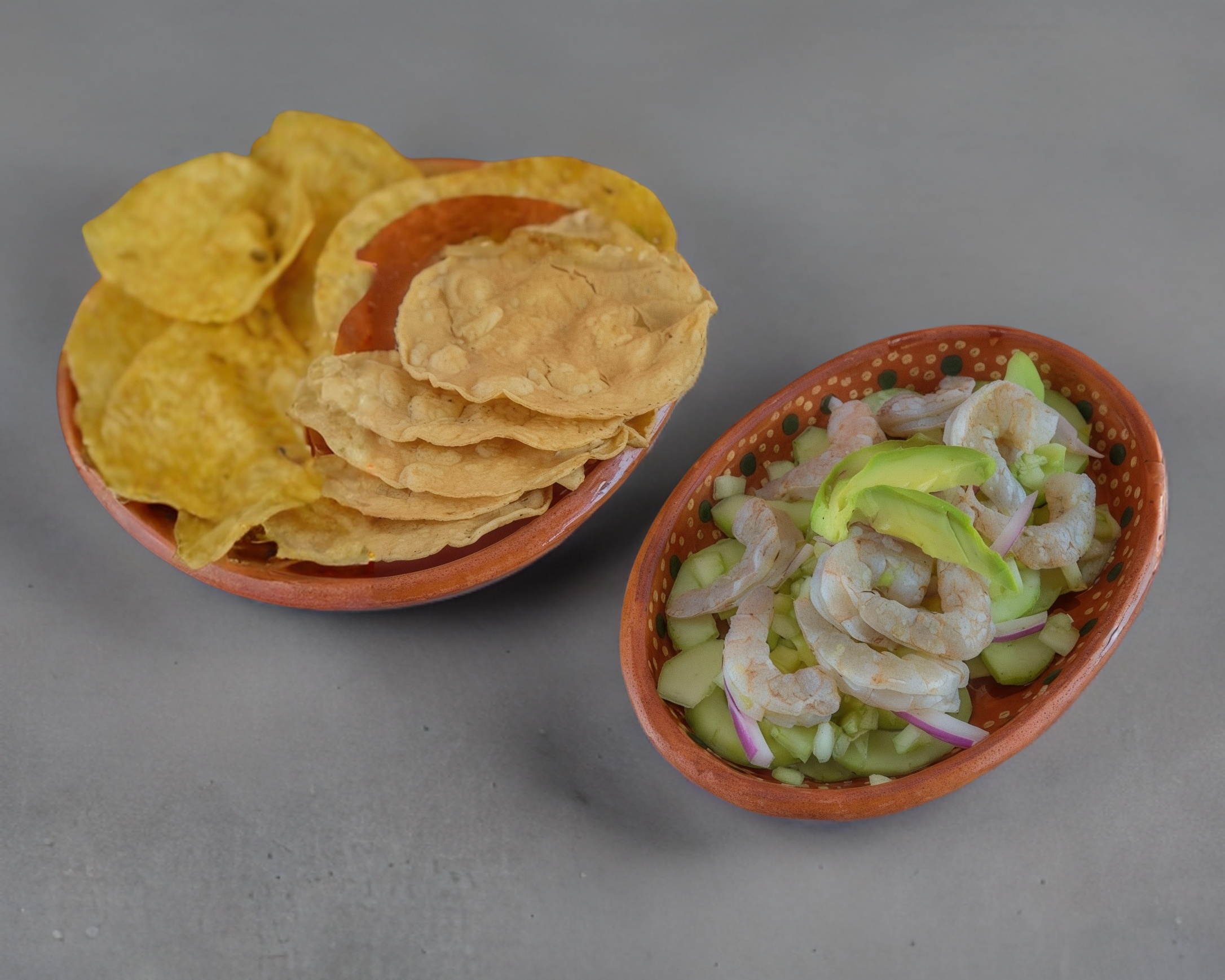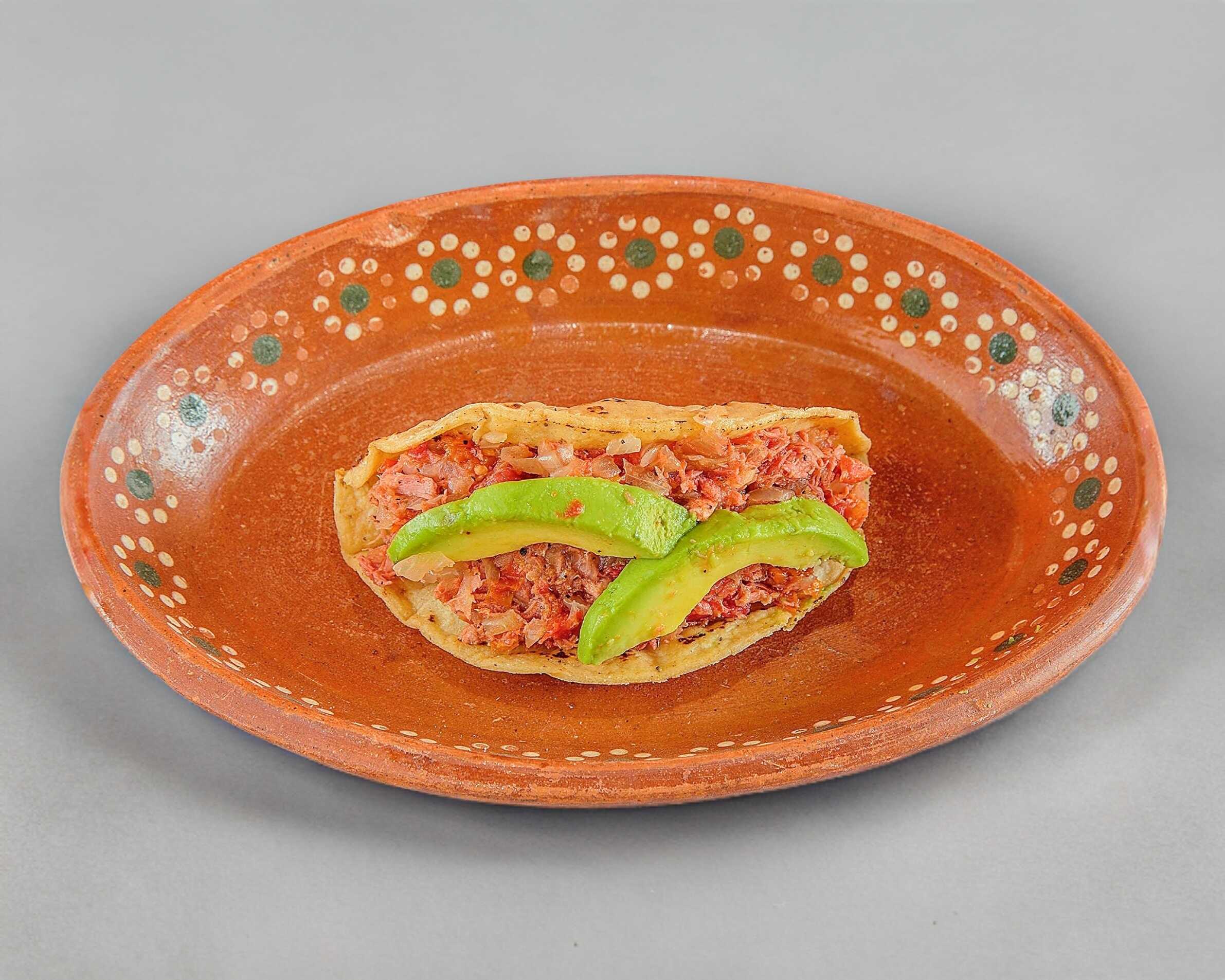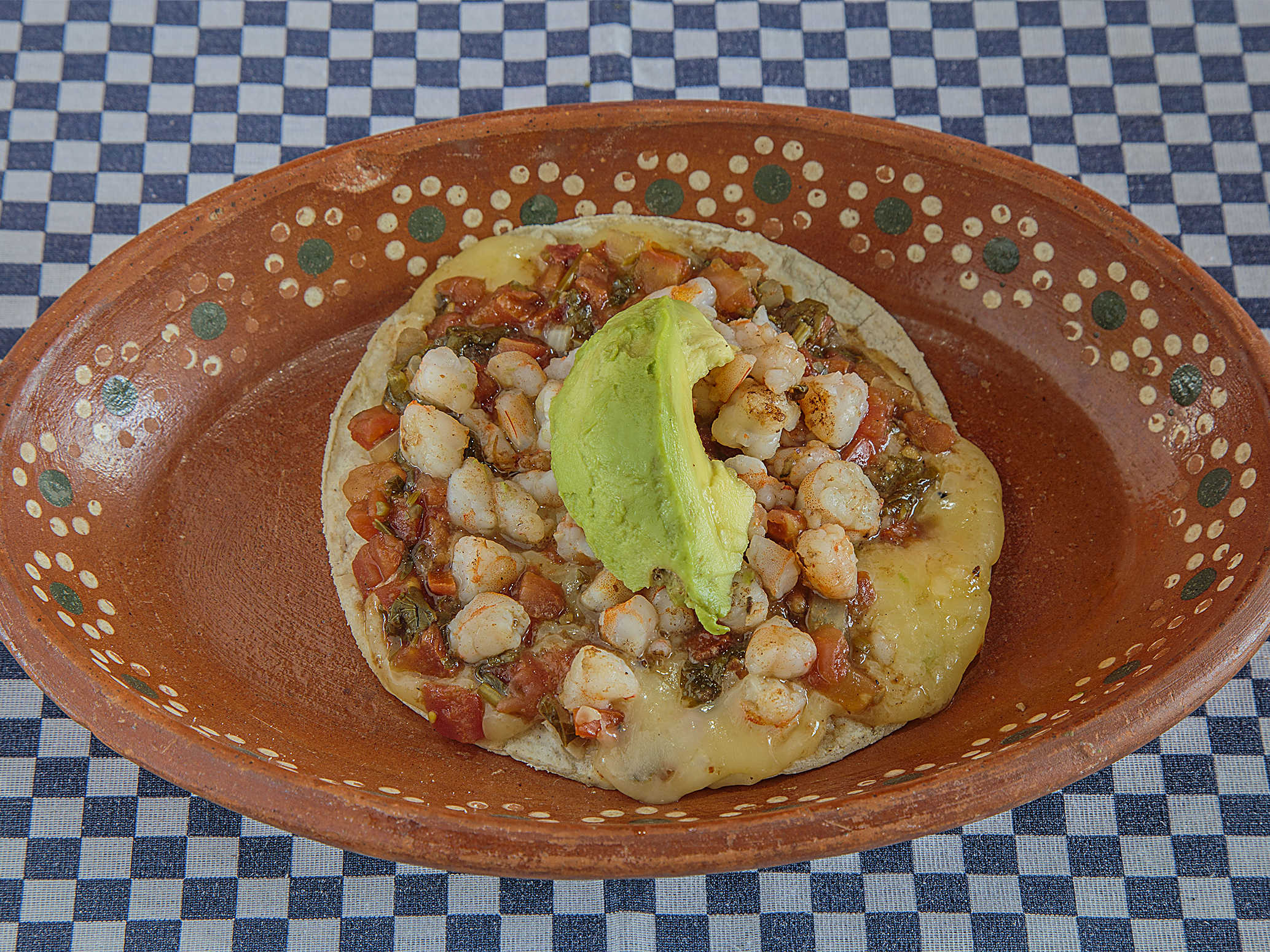 Tortilla con queso gratinado con camarón, acompañado de salsa tatemada y aguacate.