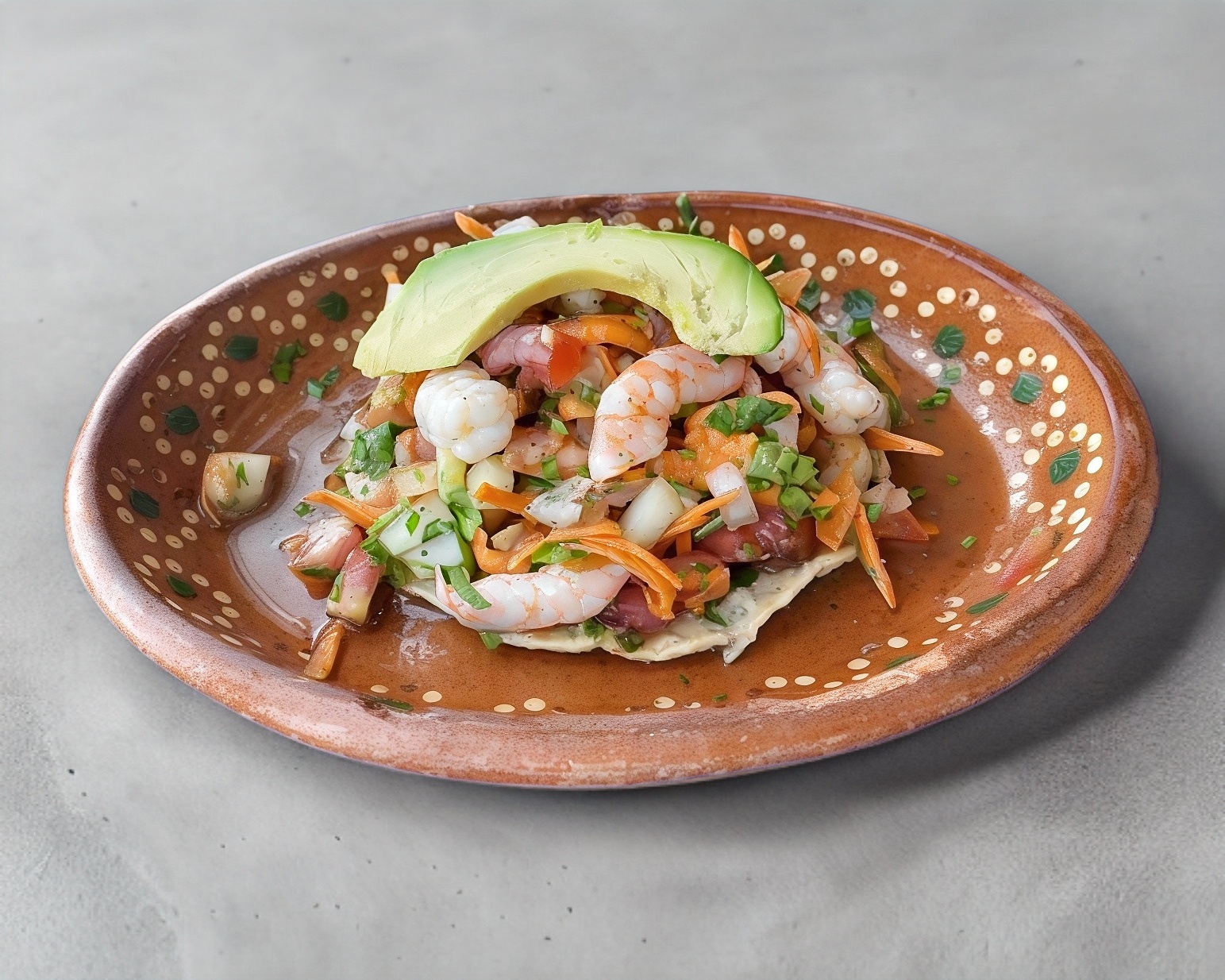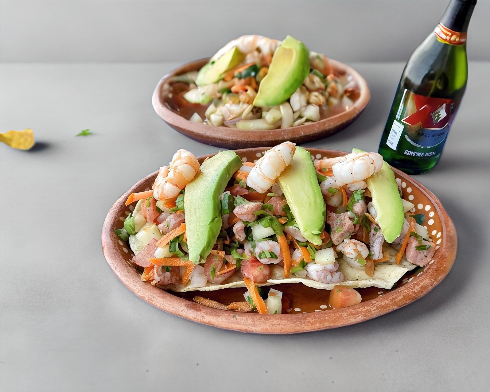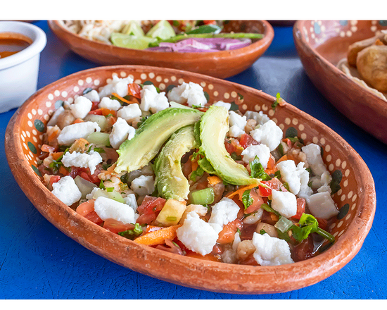 Nuestro clásico ceviche con cebolla, jitomate, cilantro, pepino, zanahoria con aguacate, clamato y salsas negras.