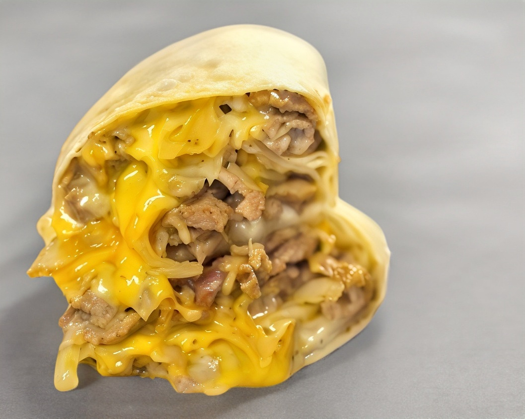 Burrito de carne 100% de res, cebolla caramelizada y mezcla de quesos Cheddar-Jack.