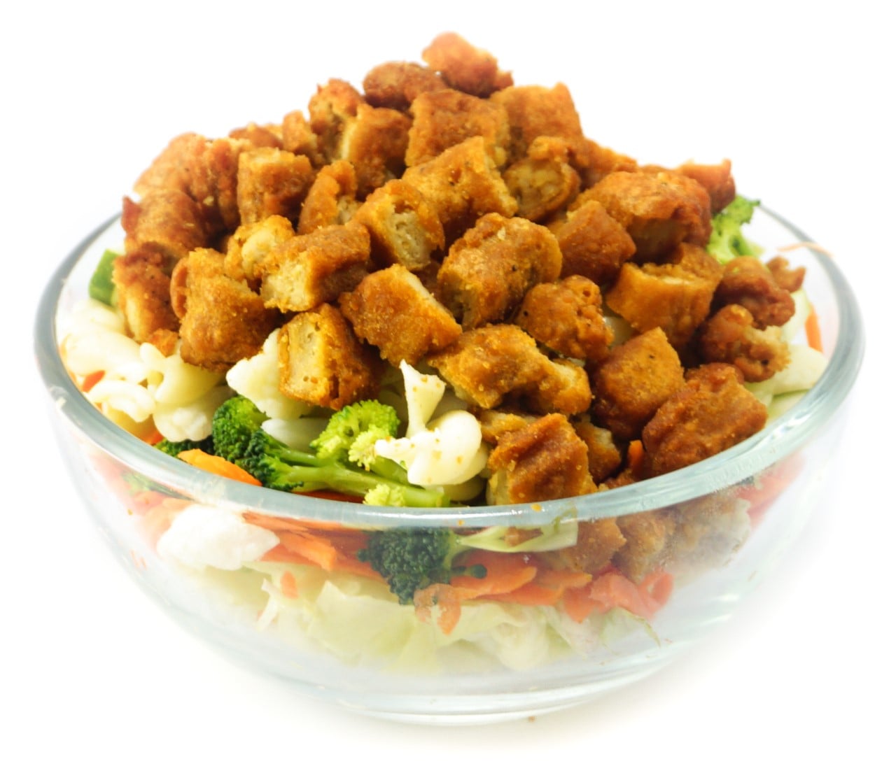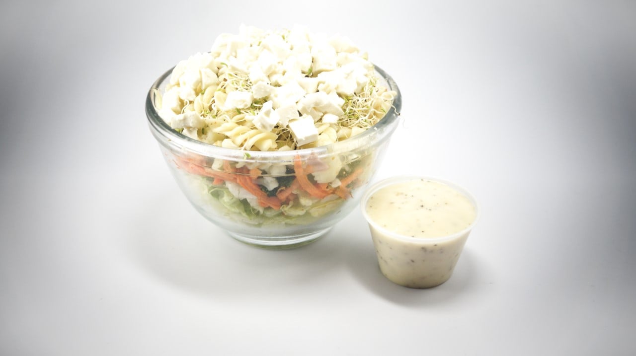 Lechga mixta, pollo empanizado, pasta fusilli, brócoli. coliflor, pepino y zanahoria.