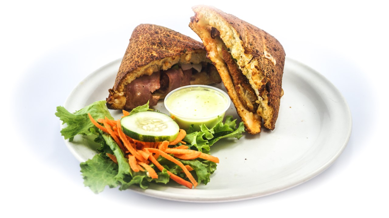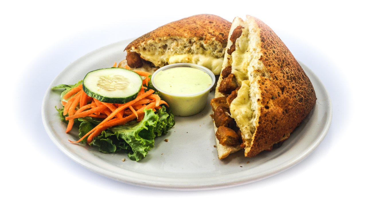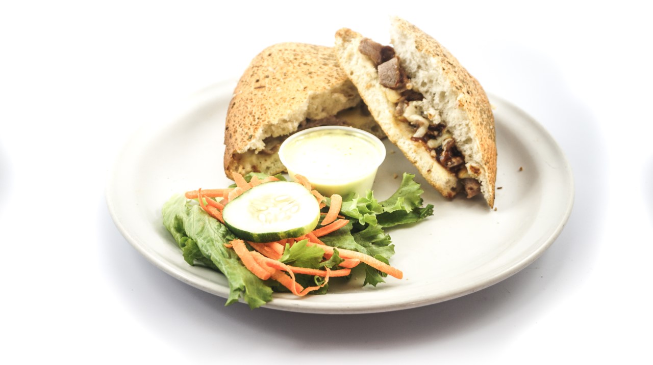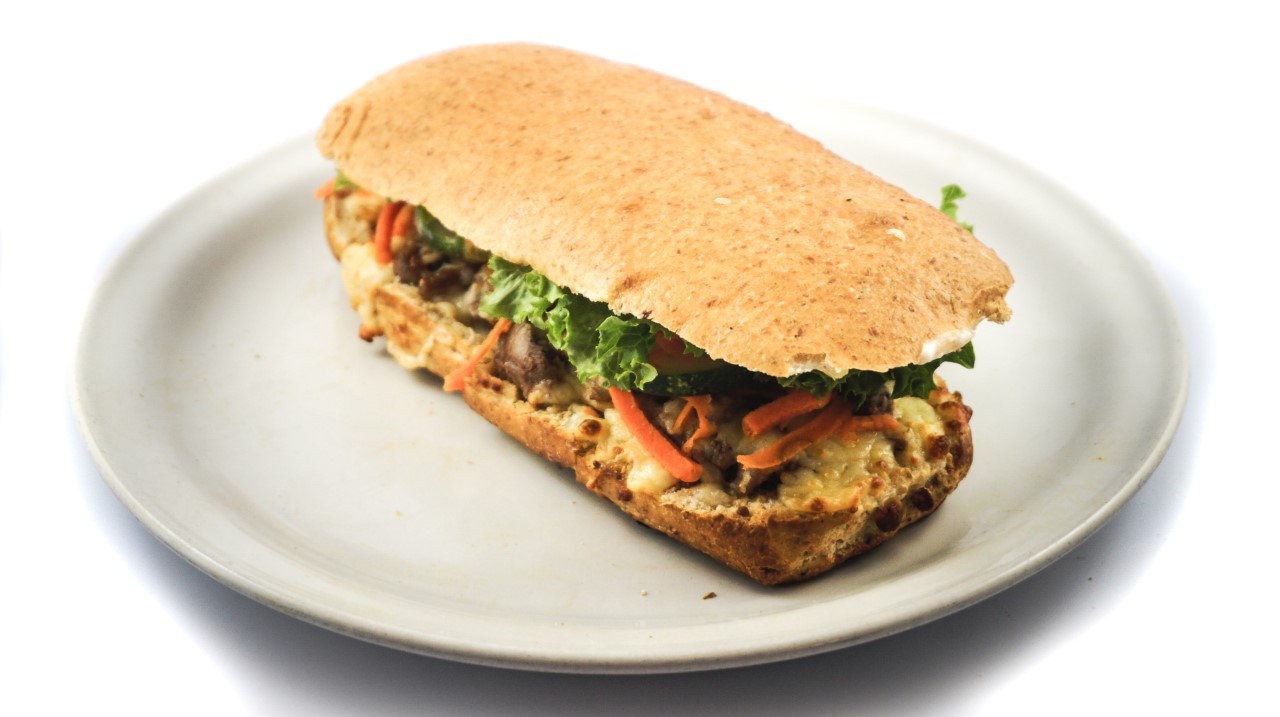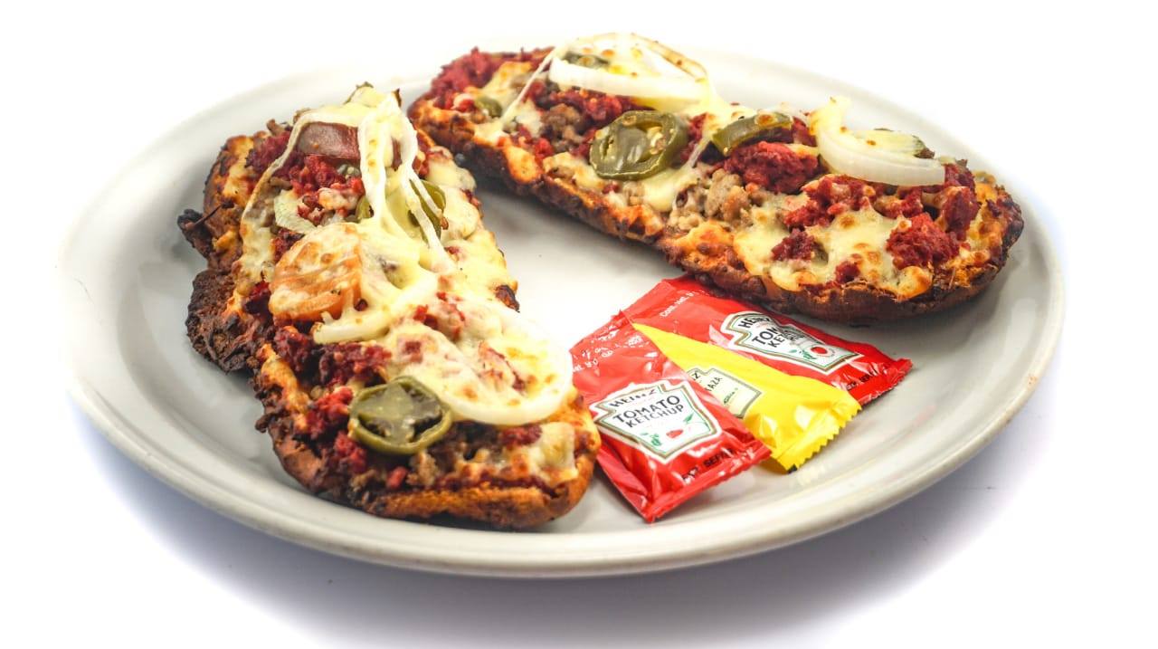 Carne asada, salsa BBQ, queso manchego y vegetales.