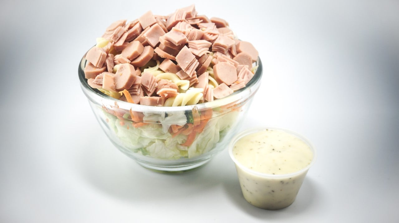 Lechuga mixta, jamón, salchicha de pavo, pasta fusilli, brócoli. coliflor, pepino y zanahoria.