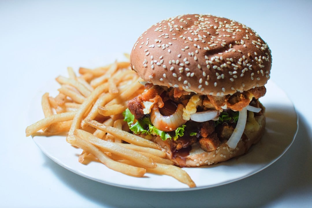 Carne de res, jamón, tocino, piña, pepinillos y queso amarillo.