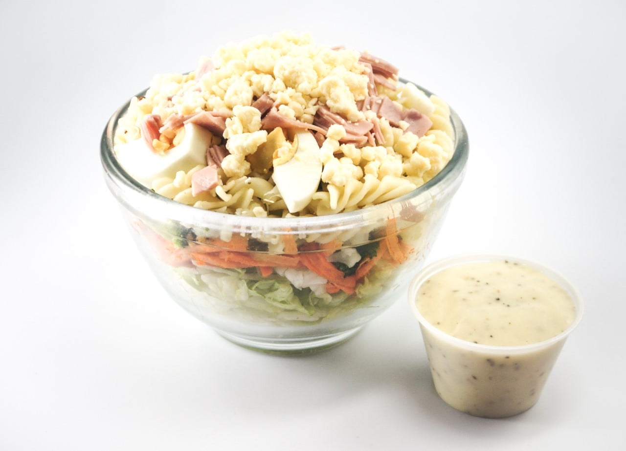 Lechuga mixta, jamón, huevo cocido, queso, pasta fusilli, brócoli, coliflor, pepino y zanahoria.